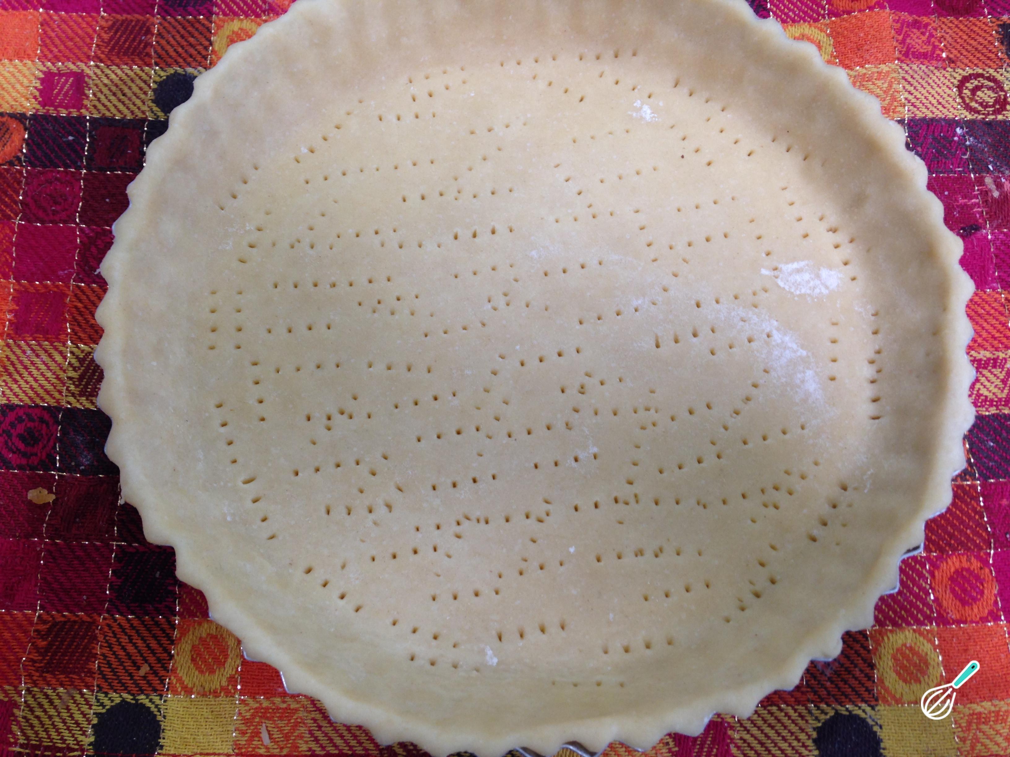 Adicione um pouco de água e misture até obter uma massa compacta, que será a base da torta. Amasse, estenda sobre uma superfície enfarinhada e reserve uma parte, que será usada para cobrir a torta. Com o restante cubra um molde de torta com ela, pique o fundo com um garfo e leve a assar a 170ºC durante 10 minutos.