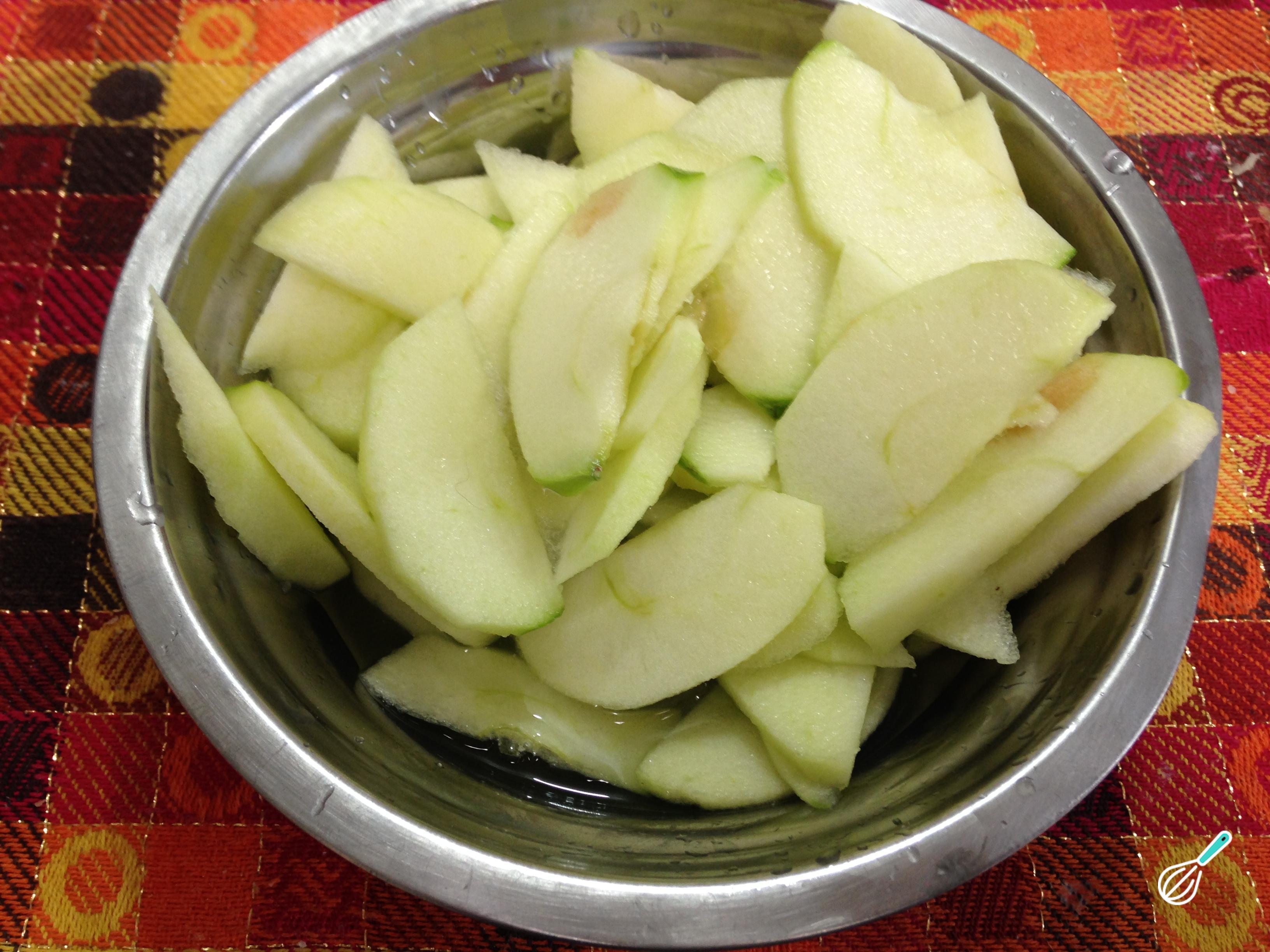 Enquanto a massa assa, descasque e corte as maçãs em fatias.