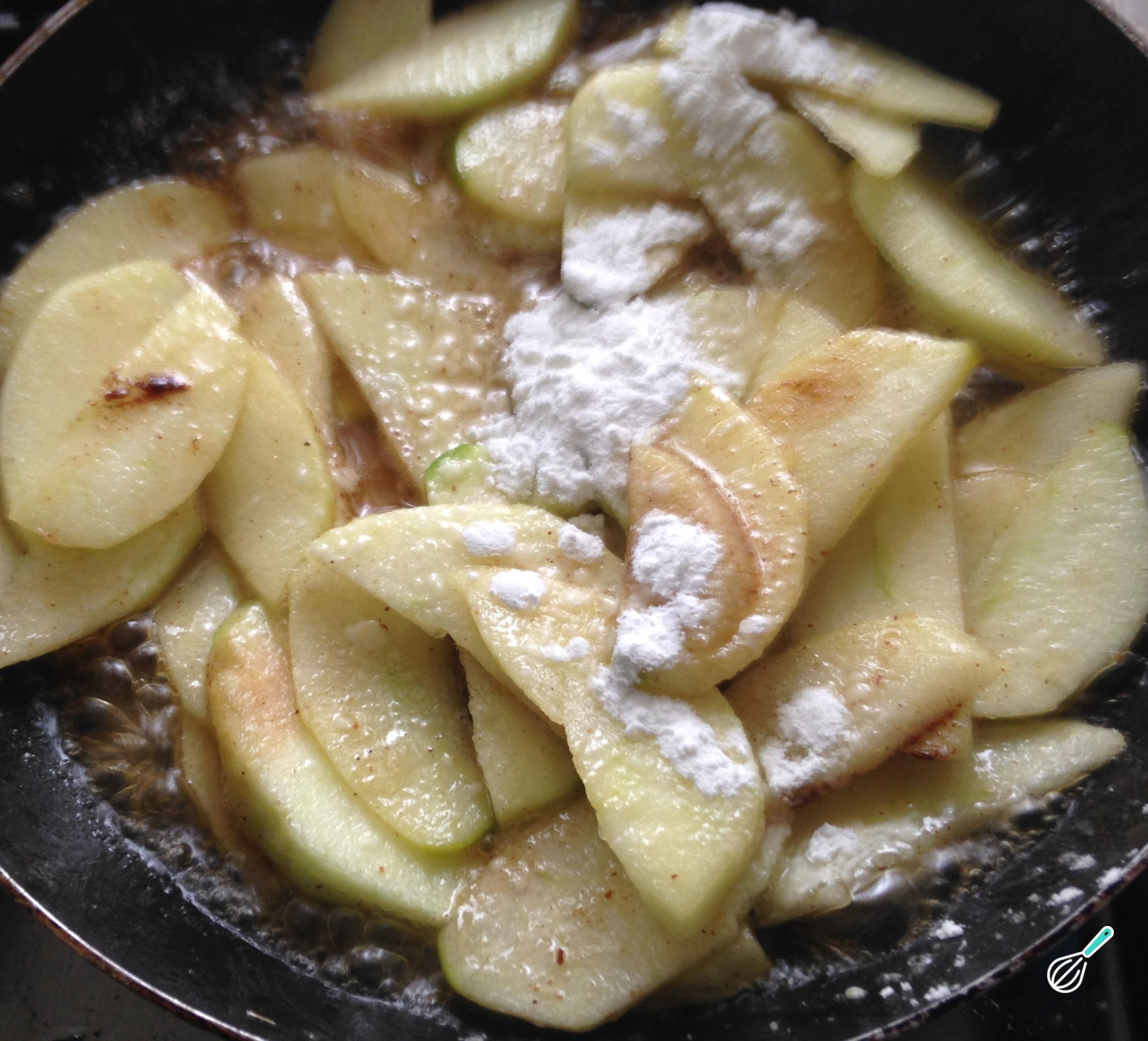 Coloque as maçãs em uma frigideira com a manteiga, o açúcar e a canela. Cozinhe em fogo baixo, para que caramelizem, e adicione também a maisena, que irá tornar a calda mais espessa.