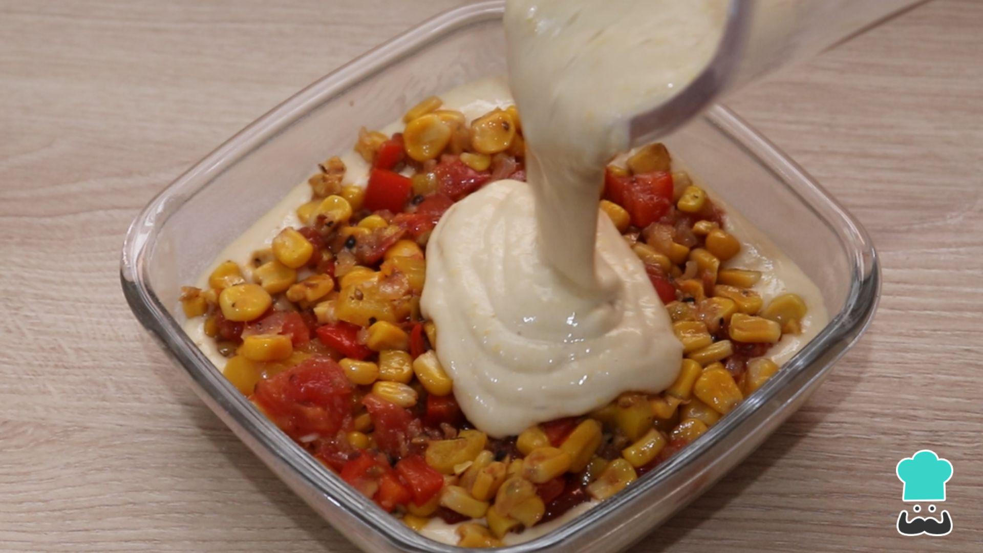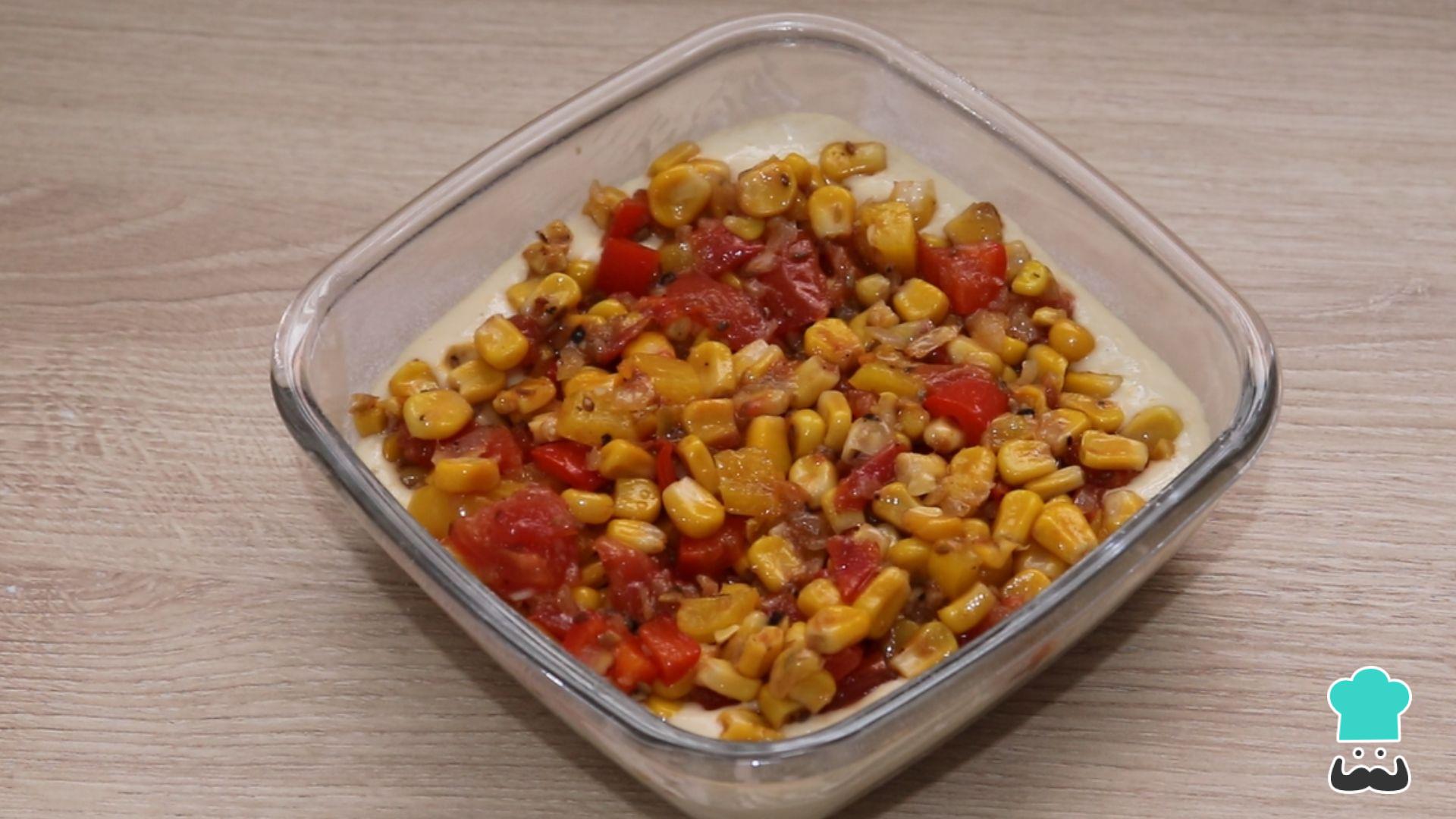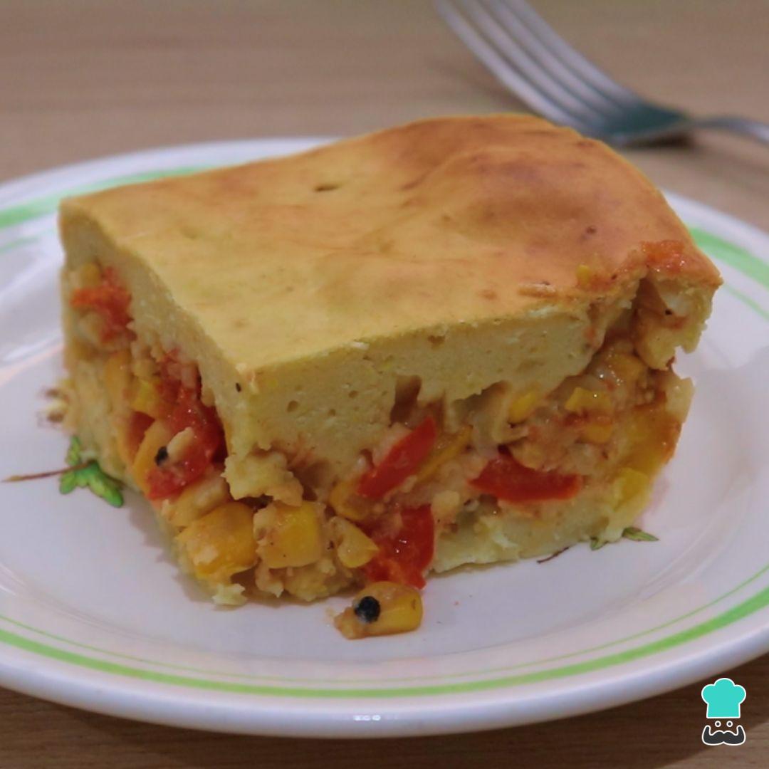 Feita no liquidificador, a nossa torta de milho traz um recheio vegetariano feito com um delicioso refogado com pimentão, tomate, milho, alho e cebola.
