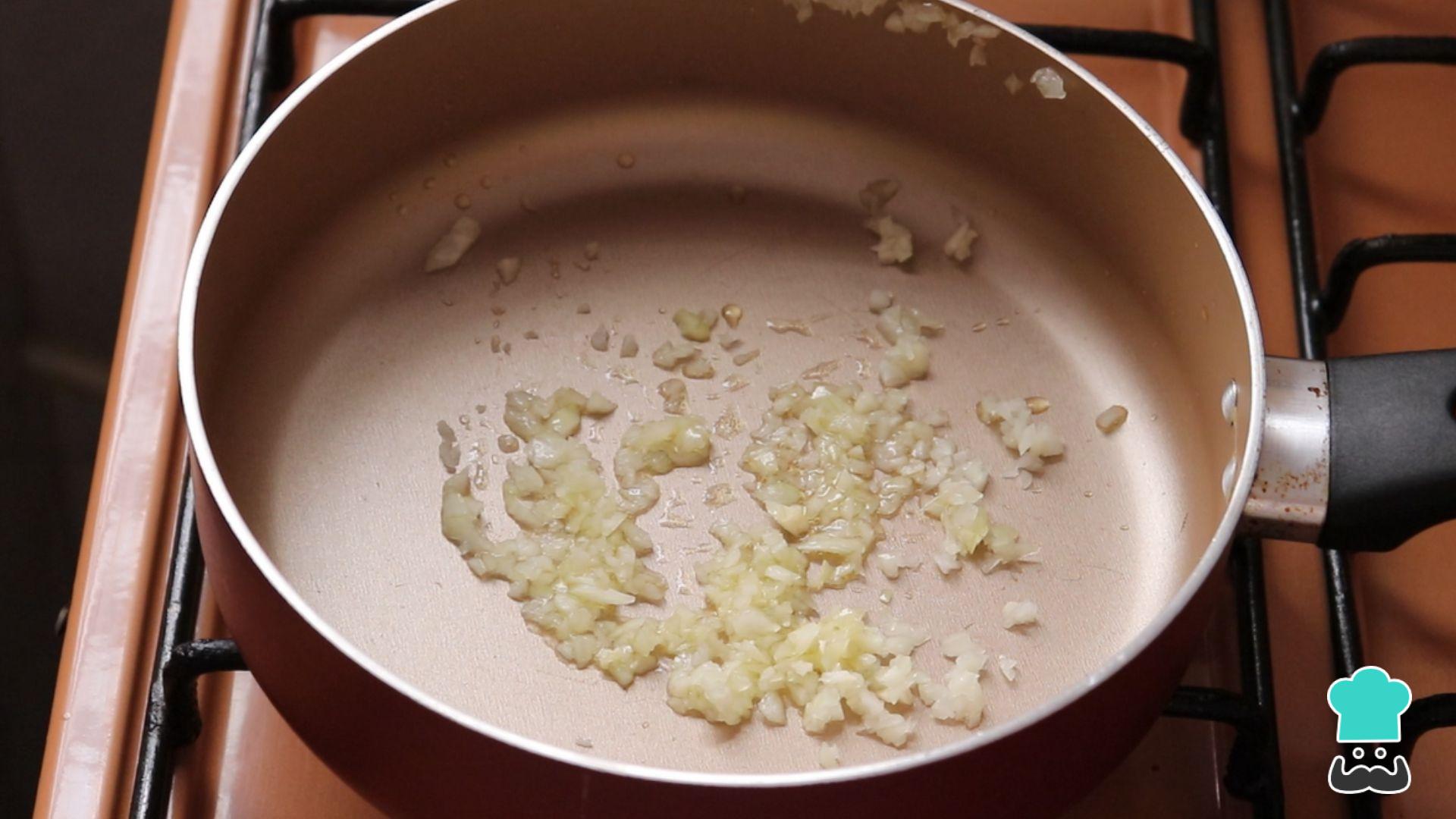 Depois leve uma panela ao fogo médio e refogue o alho e a cebola no azeite.