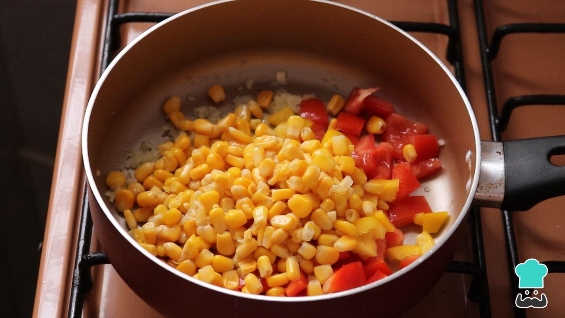 Junte o tomate, os pimentões e metade da lata de milho e refogue até os ingredientes ficarem macios. Desligue e fogo e reserve.