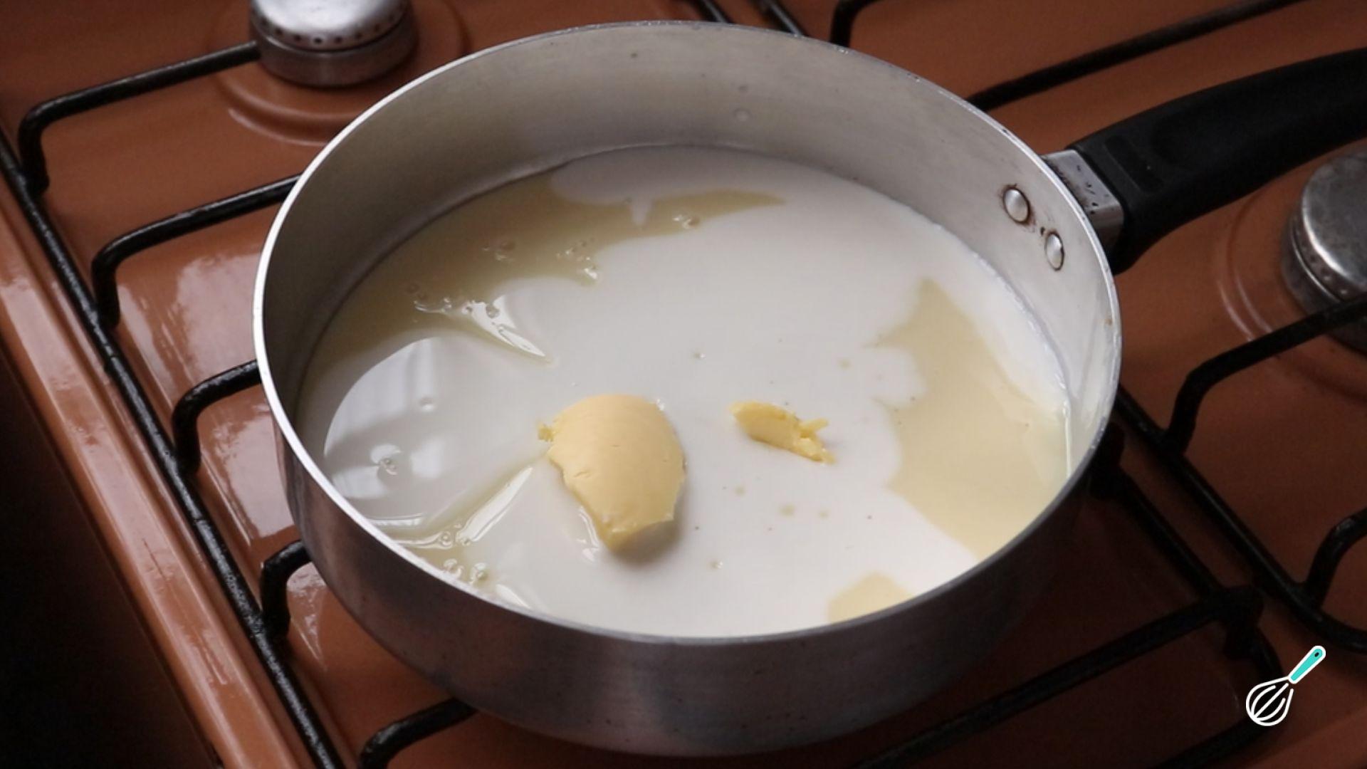 O primeiro passo para preparar a sua Torta de morango com biscoito é preparar o recheio de brigadeiro. Coloque o leite condensado, o leite integral e a manteiga em uma panela e leve ao fogo médio. Cozinhe até soltar do fundo da panela. Retire e deixe esfriar.