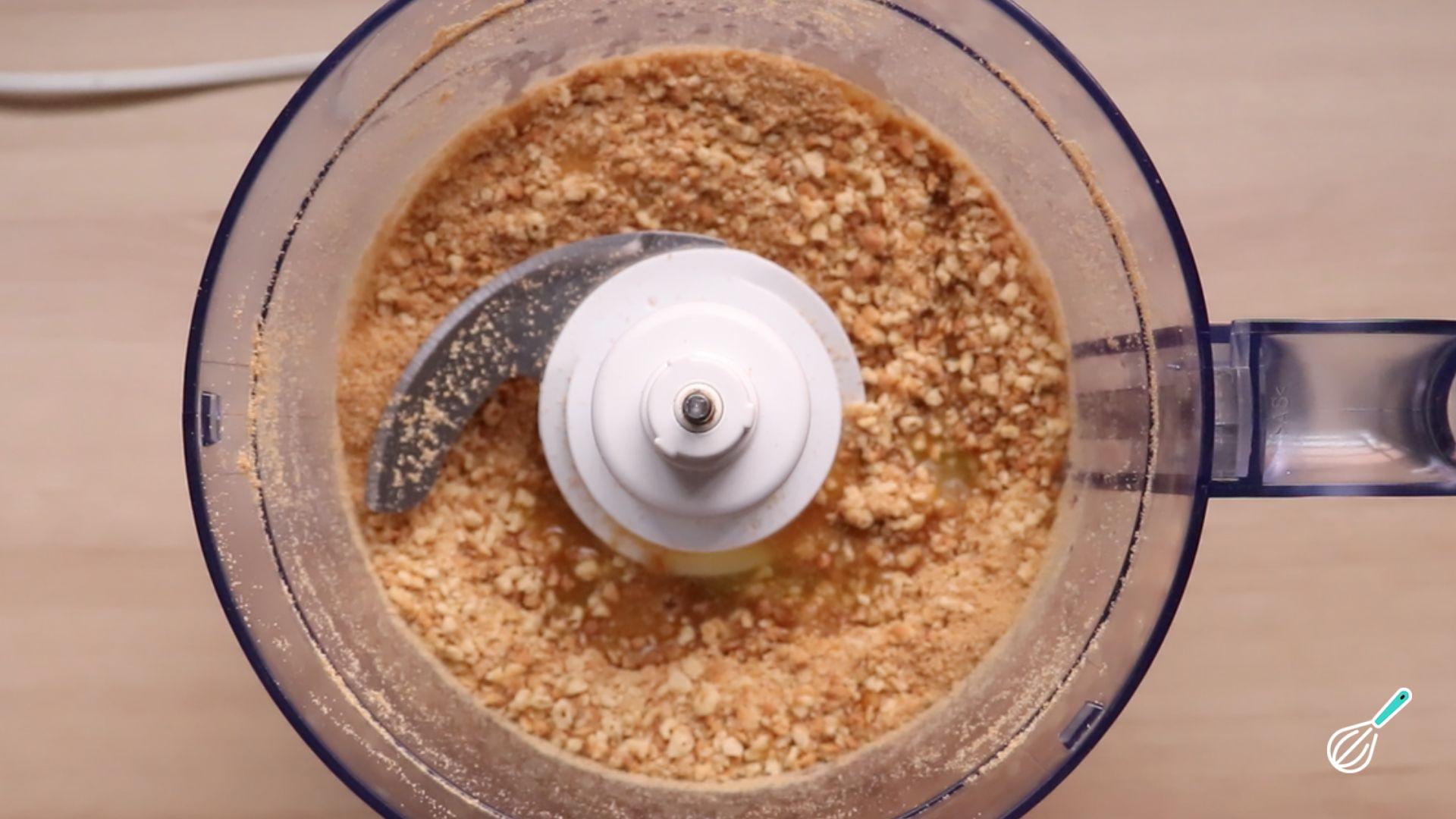 Enquanto isso prepare a base da torta: triture o biscoito e em seguida adicione a manteiga derretida e bata mais uma vez.