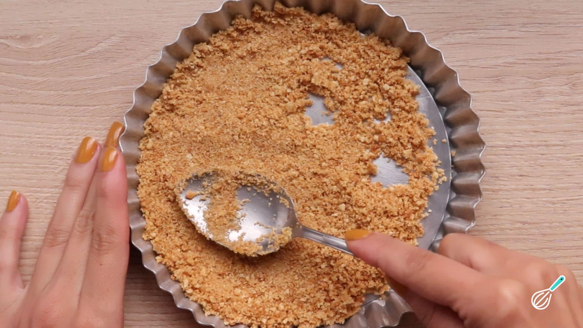 Dica: misture bem a manteiga com o biscoito para garantir que a massa fique no formato desejado.