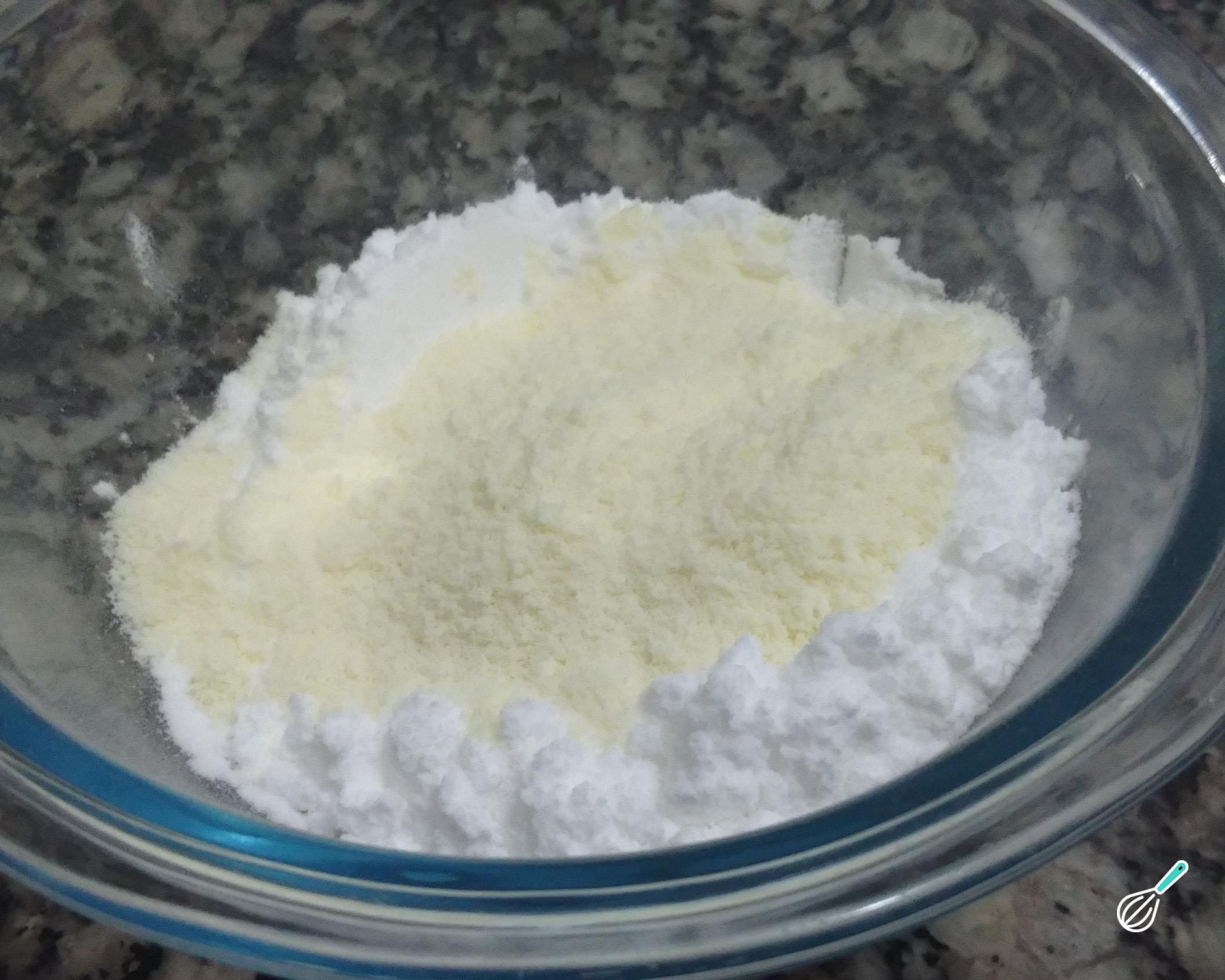 Peneire o açúcar de confeiteiro junto com o leite em pó, para dissolver todos os grumos. Estes ingredientes vão ajudar a firmar o chantilly, não substitua por outros.