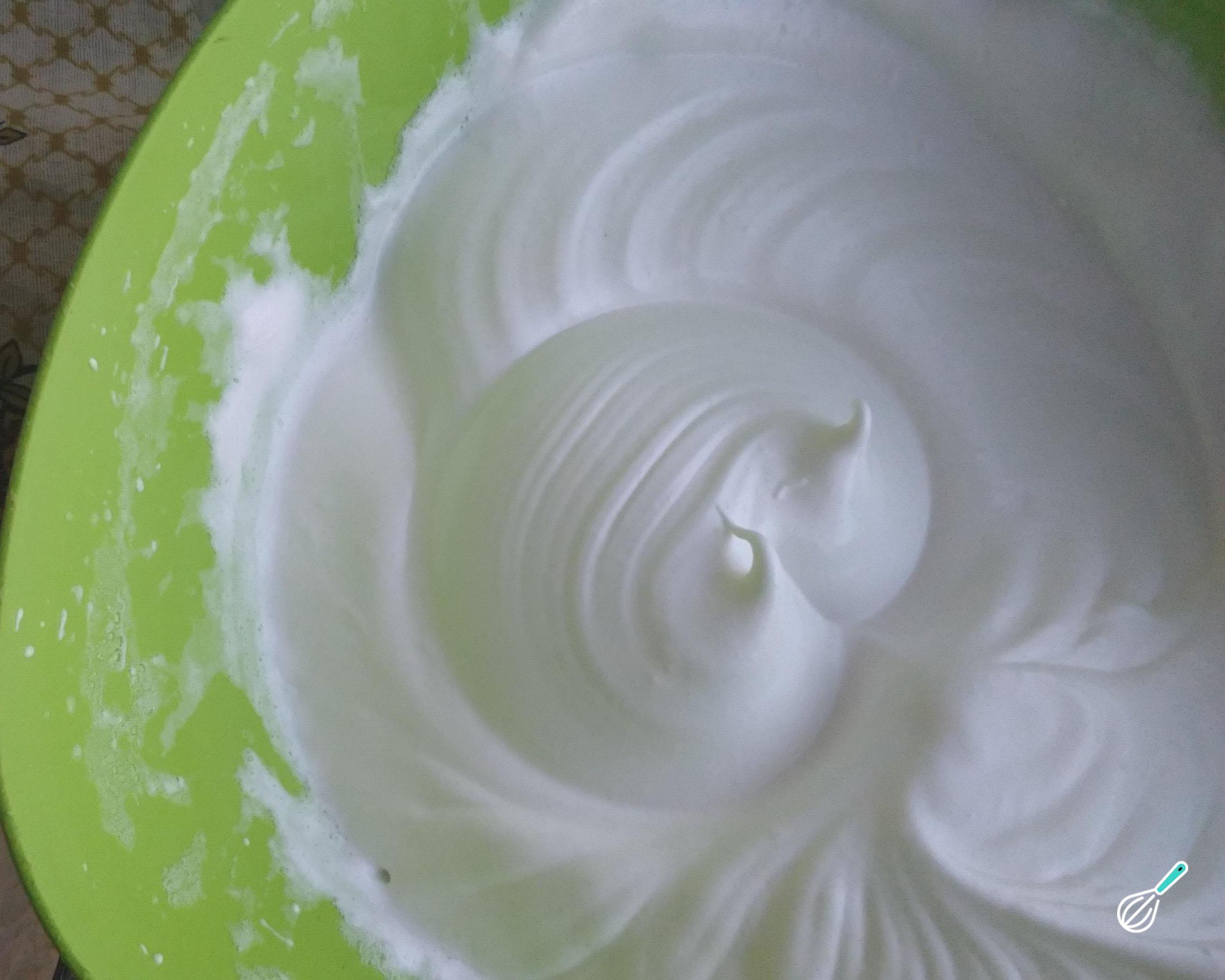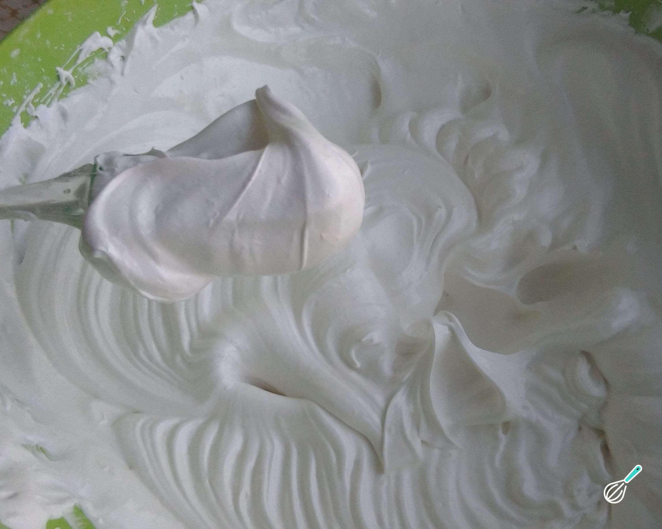 Por fim adicione a maisena peneirada e bata até incorporar. O ponto do merengue deverá ser bem suave e formando picos, como na foto. Não bata demasiado para evitar passar do ponto.