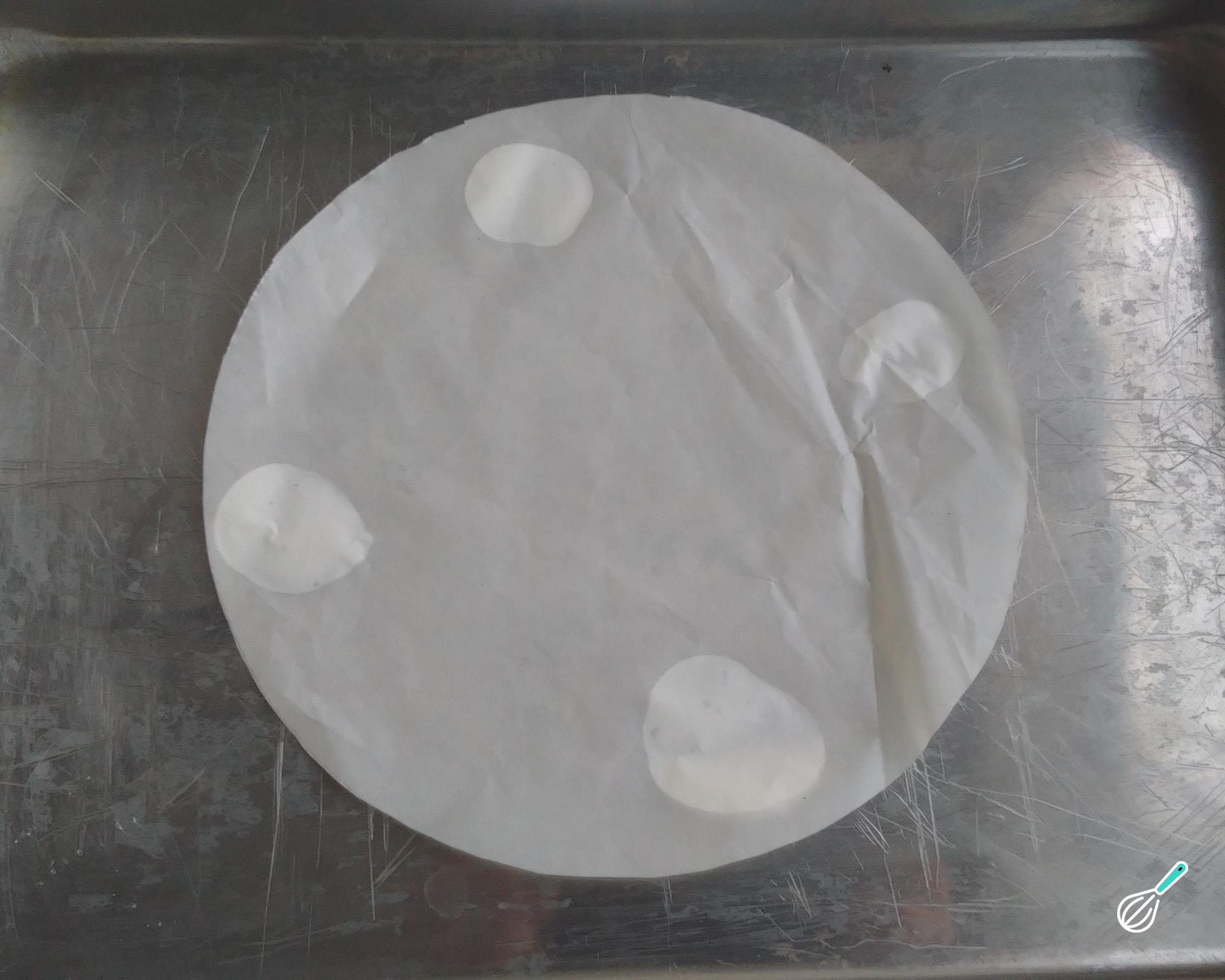 Dica: É importante usar o papel manteiga como referência para o tamanho dos discos de merengue. Se você não tiver papel manteiga unte a bandeja ou tabuleiro de forno e coloque 3 porções de merengue com mais ou menos 20 cm de diâmetro (pode usar uma forma de bolo desse tamanho como referência).