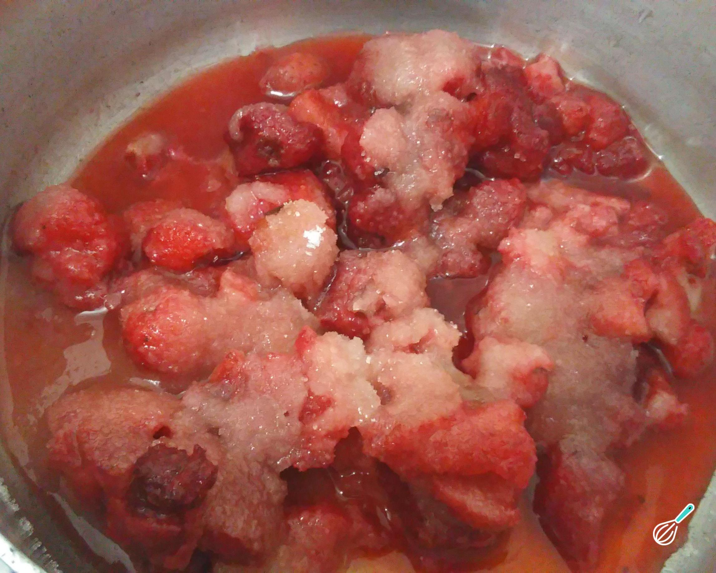 Durante esse tempo você pode ir preparando o doce de morango caseiro: lave os morango, pique em pedaços e coloque numa panela junto com o açúcar e o suco de limão.
