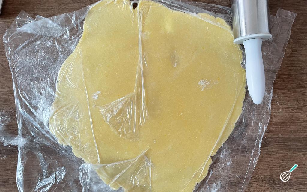 Retire a massa da geladeira e abra-a com a ajuda de um rolo e entre dois plásticos.