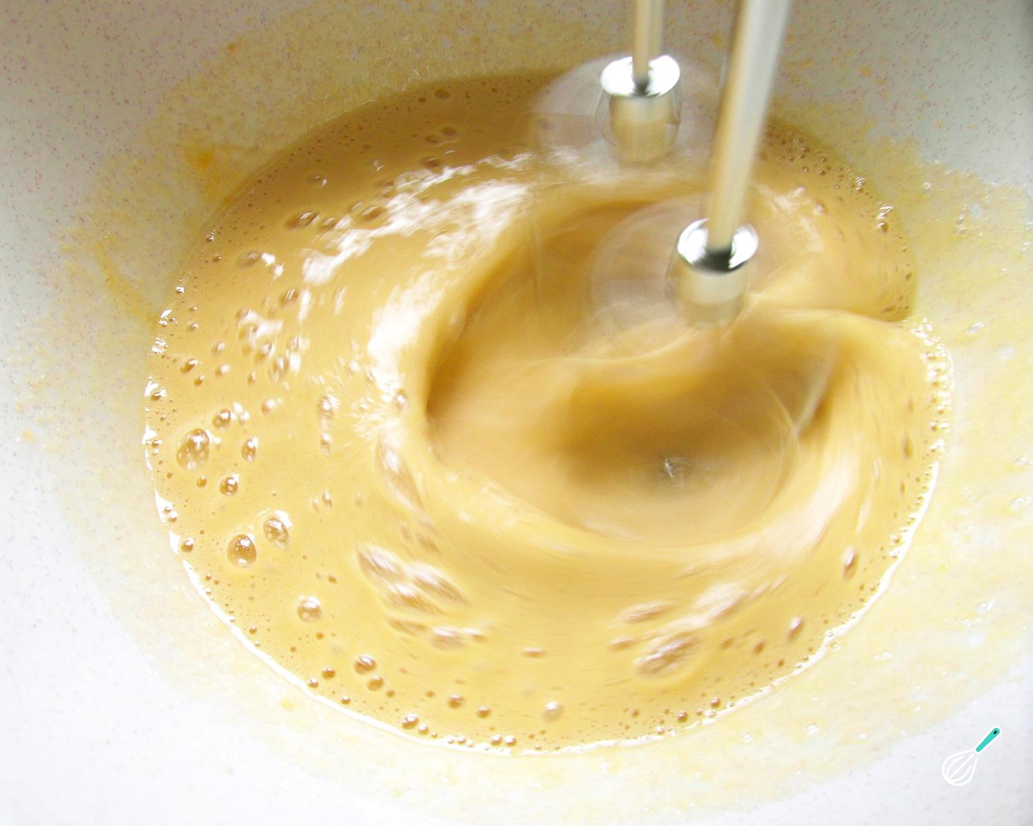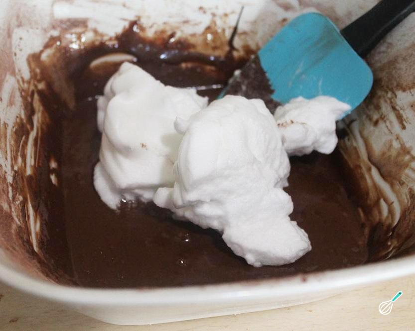 Adicione as claras batidas na mistura anterior e envolva delicadamente com uma espátula ou fouet, para incorporar na massa sem perder o ar. Por fim coloque o fermento e mexa somente até misturar.