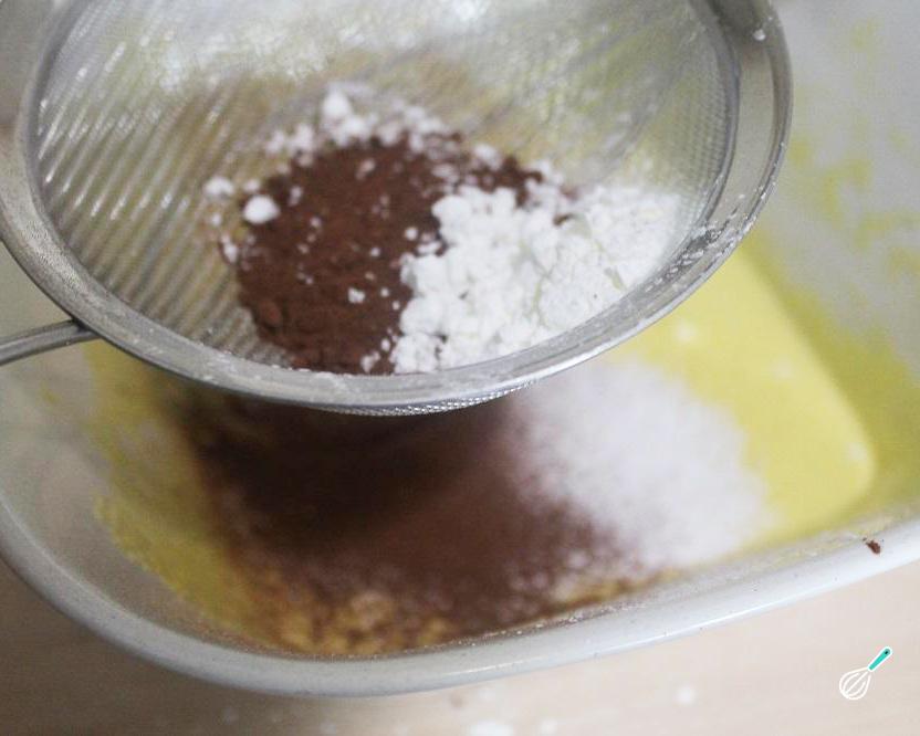 Coloque a farinha, o açúcar e o cacau ou chocolate na mistura de gemas e açúcar e mexa. Ligue o forno nos 180ºC.