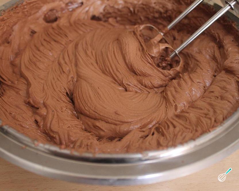 Para conseguir uma mousse de chocolate bem suave para rechear esta sobremesa, retire a mousse da geladeira e bata com a batedeira até ficar cremosa e dobrar de volume, como na foto.