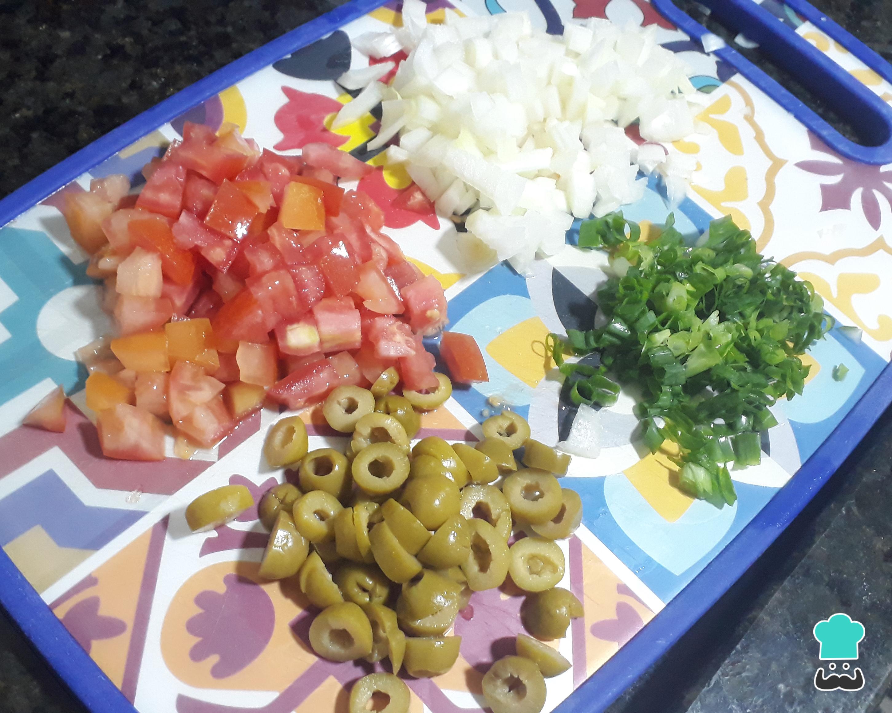 Primeiramente, corte os temperos frescos: a cebola, o tomate, a azeitona e o cheiro verde. Lembre-se de cortá-los em tamanho uniforme.