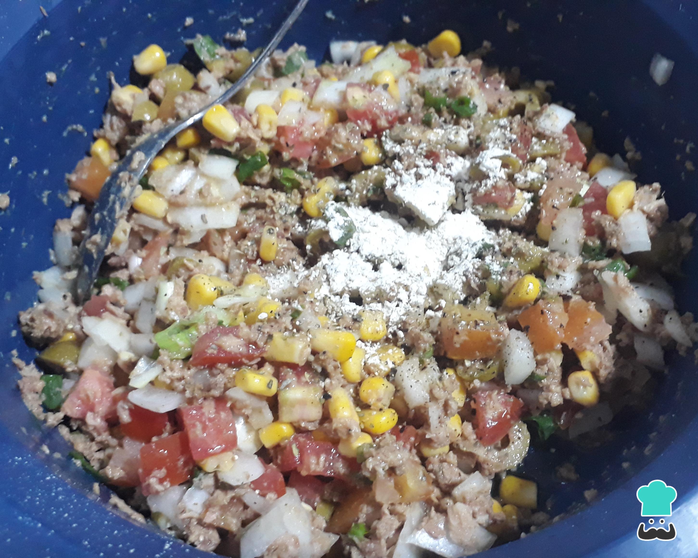 Agora misture os temperos frescos do passo anterior com as duas latas de atum ralado e o milho. Por fim, acrescente os temperos secos (alho em pó, oréganos, sal e pimenta), para dar um toque especial no recheio. Misture bem.