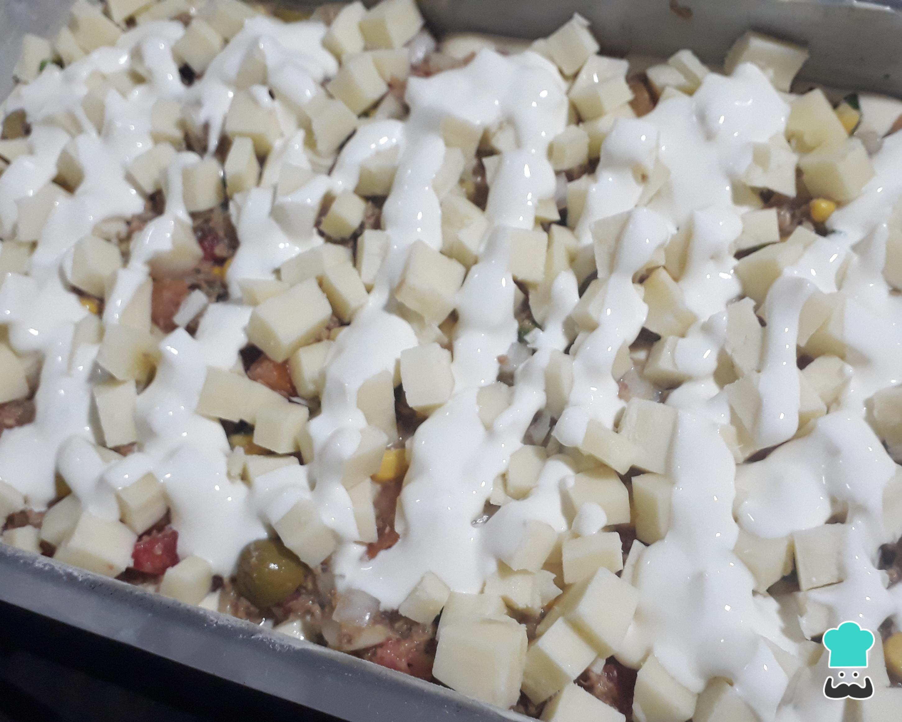 Em uma assadeira untada com margarina e trigo despeje metade da massa, o recheio de atum, a mussarela cortada em cubos e requeijão cremoso.
