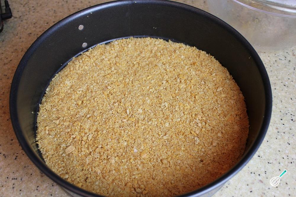 Para fazer torta de Ovomaltine comece por triturar o biscoito. Junte a manteiga derretida e volte a triturar. Coloque o biscoito em uma forma de fundo amovível e pressione com uma colher, para compactar bem a base da torta. Reserve no frio.