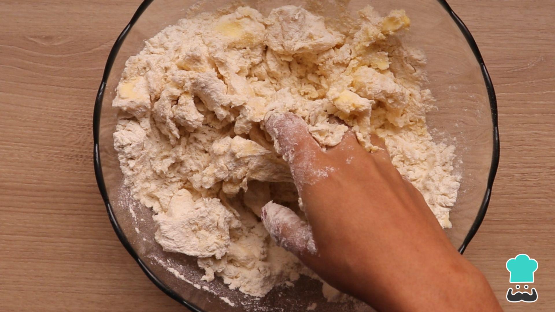 Começando pela massa da nossa Torta de palmito massa podre com margarina: misture com as mãos todos os ingredientes em uma tigela grande.