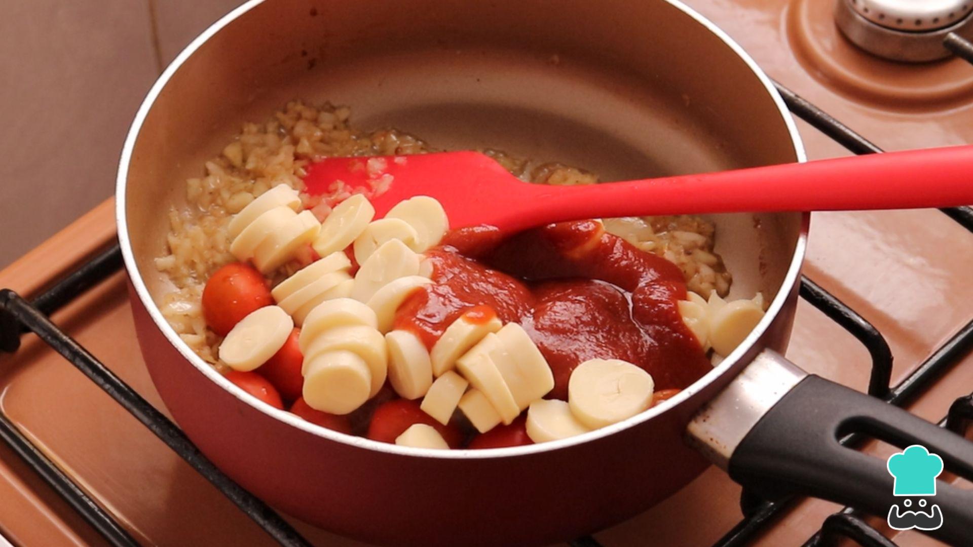 Enquanto isso prepare o recheio: leve uma panela ao fogo médio, despeje o azeite e refogue o alho e a cebola. Junte o extrato de tomate, os tomates grapes, o palmito cortado em rodelas e tempere com sal e pimenta. Mexa bem e refogue por 5 minutos.