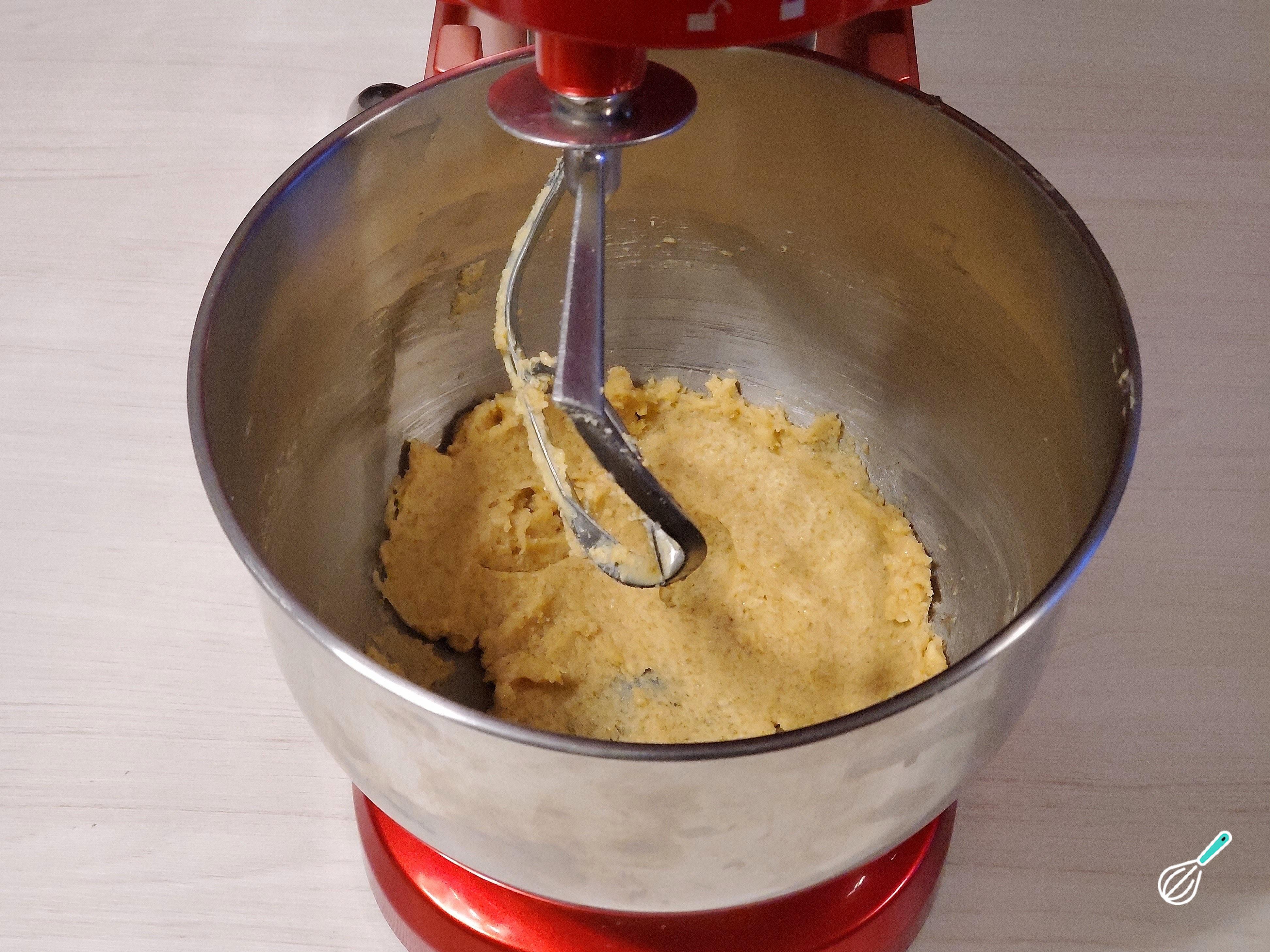 A seguir, incorpore os ovos um a um, ou seja, reduza a velocidade e despeje um ovo, aumente a velocidade e bata até que se incorpore à mistura de manteiga. Em seguida, repita o mesmo procedimento com o outro ovo.