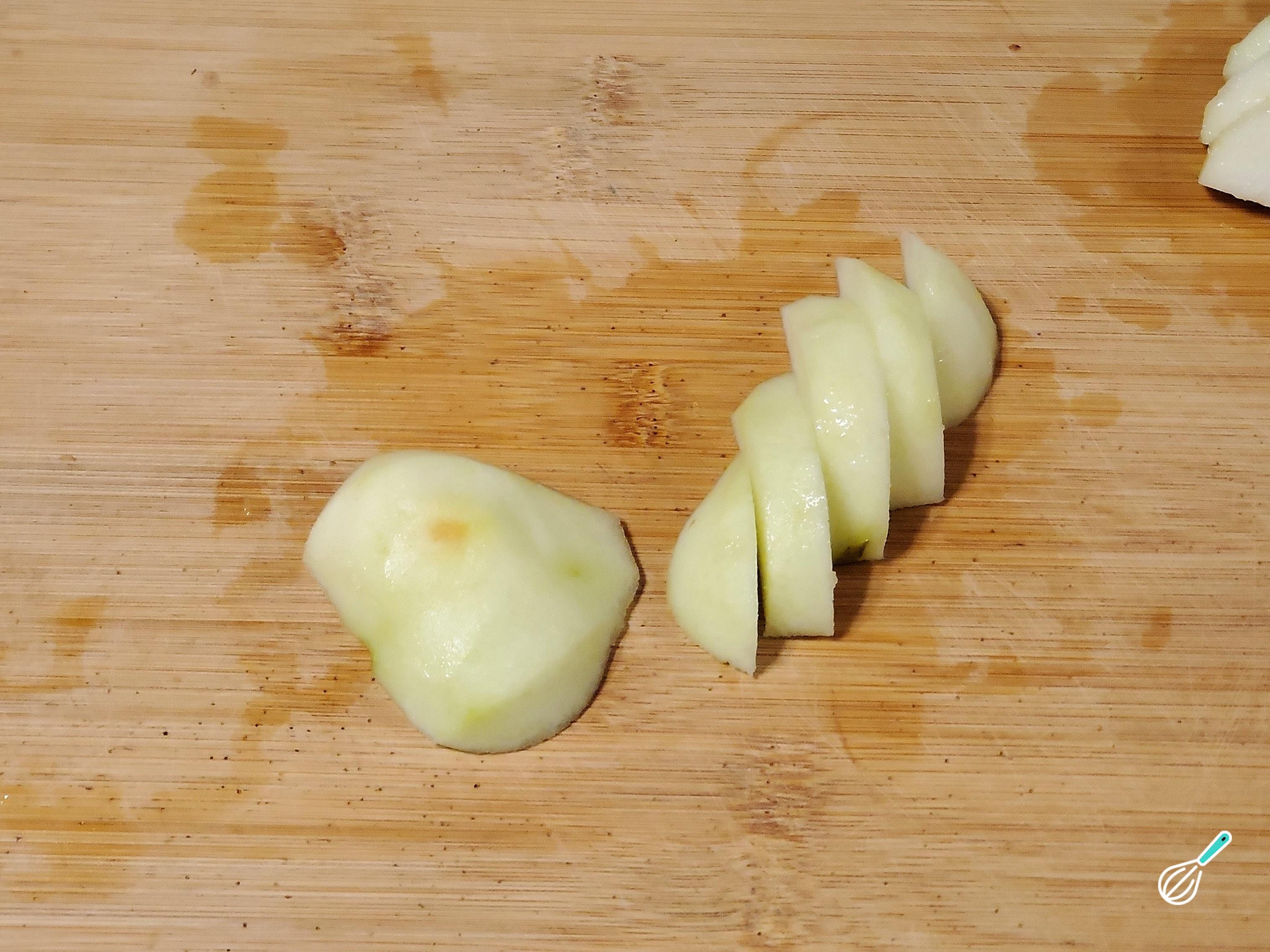 Num tabuleiro coloque as peras lavadas e descascadas. Você pode deixá-los assim para introduzi-los na massa ou cortar nas pontas para retirar o meio. Além disso, se você quiser, pode cortar essas peças em fatias grossas.