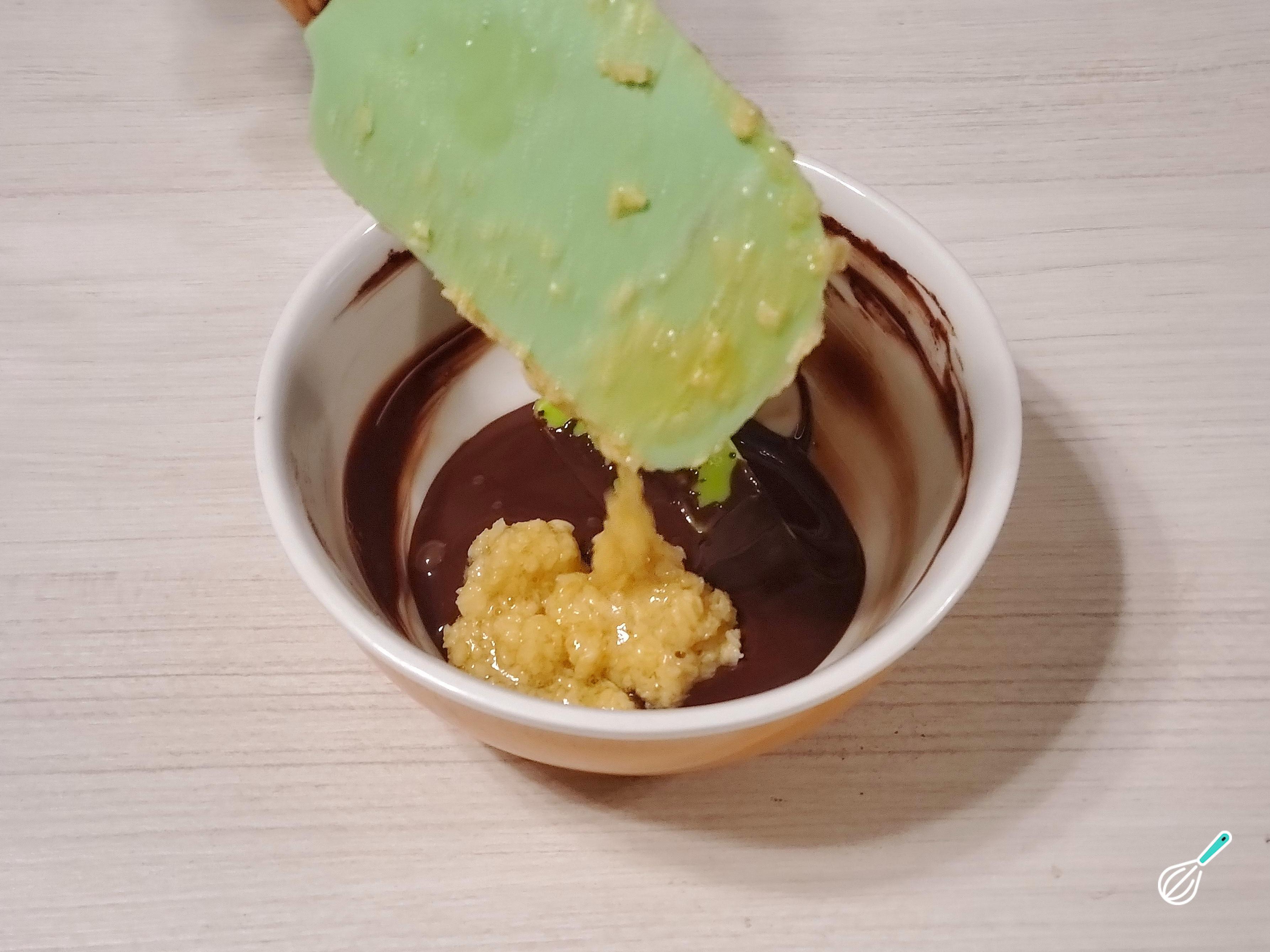 Em outra tigela, derreta o chocolate amargo. Você pode fazer em banho-maria ou no micro-ondas, tomando cuidado para não queimar. Quando estiver bem derretido, adicione algumas colheres de sopa da massa de manteiga e misture bem.