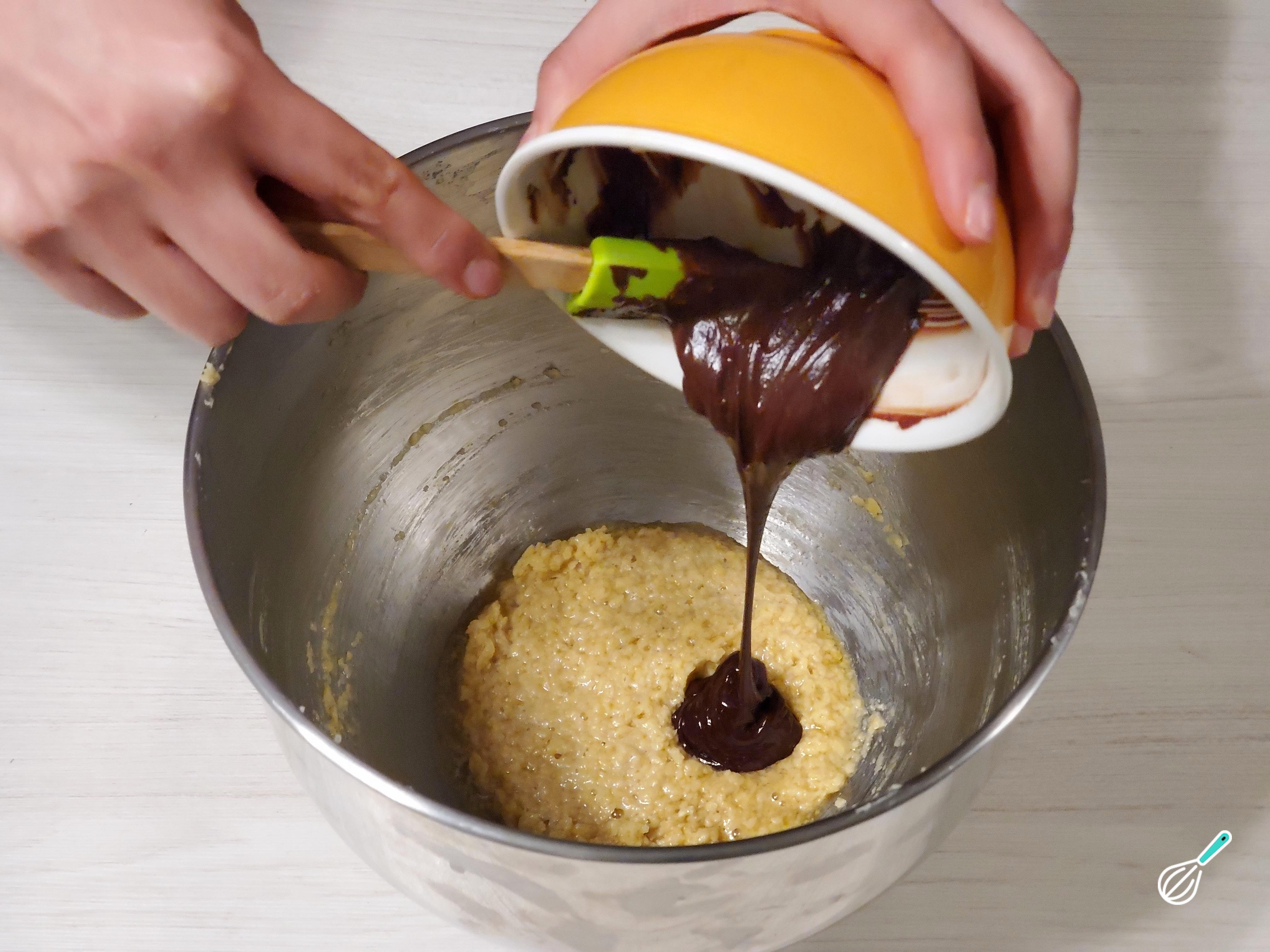 Quando o chocolate é misturado com outros ingredientes, ele suporta temperaturas mais frias sem cristalizar. Ou seja, ao misturar com o restante da massa, ela não vai mais endurecer e vai ficar como lascas. Vire esta tigela de chocolate para a massa anterior e misture imediatamente em velocidade baixa ou com uma espátula de borracha até incorporar.
