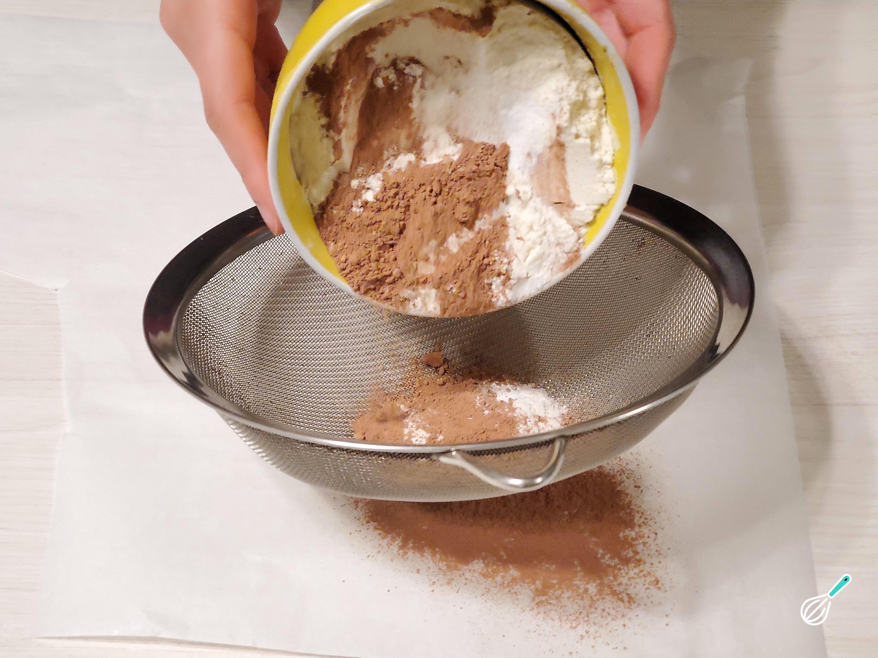 À parte, peneire os ingredientes secos que são a farinha, o fermento e o cacau em pó.