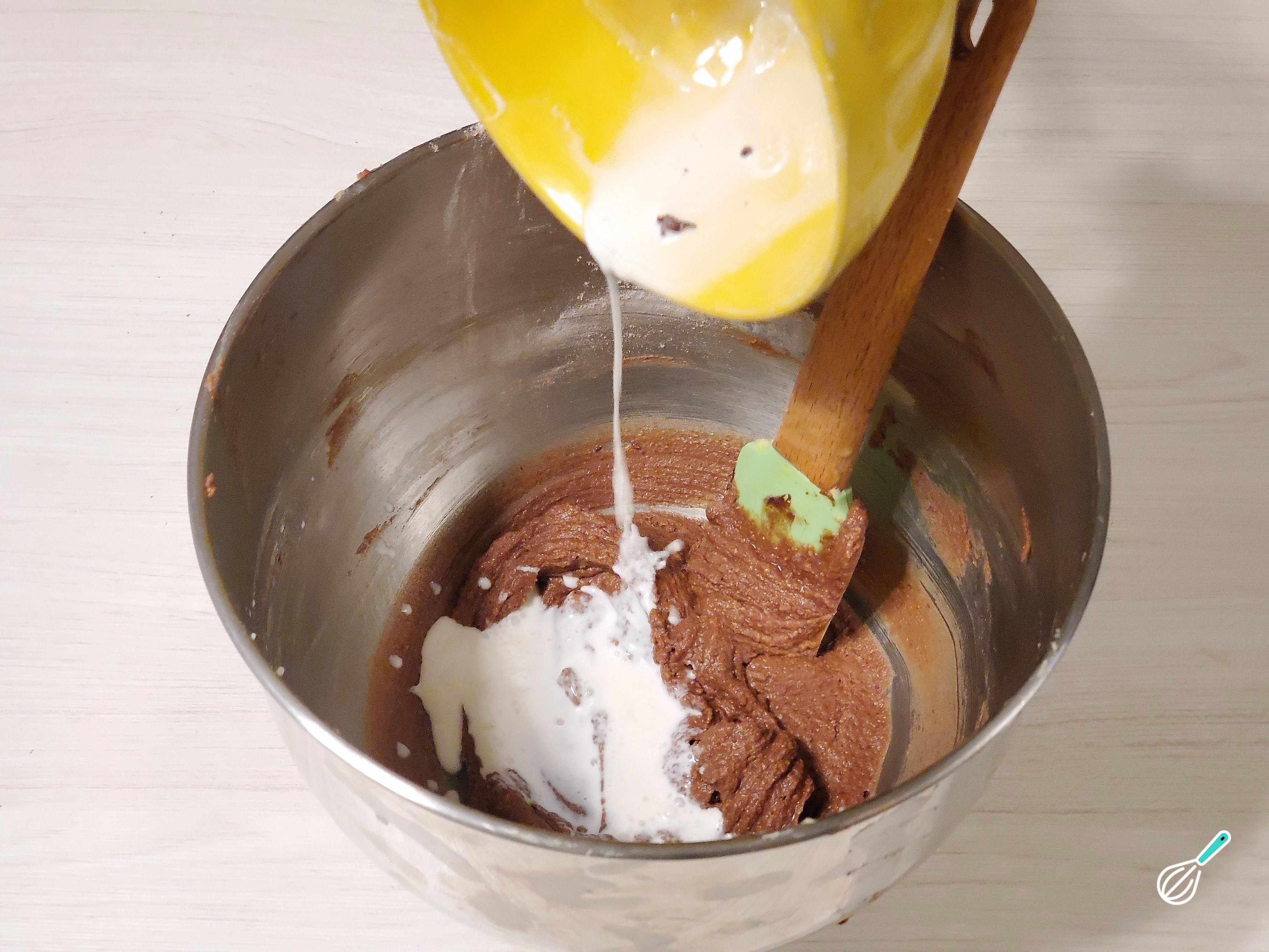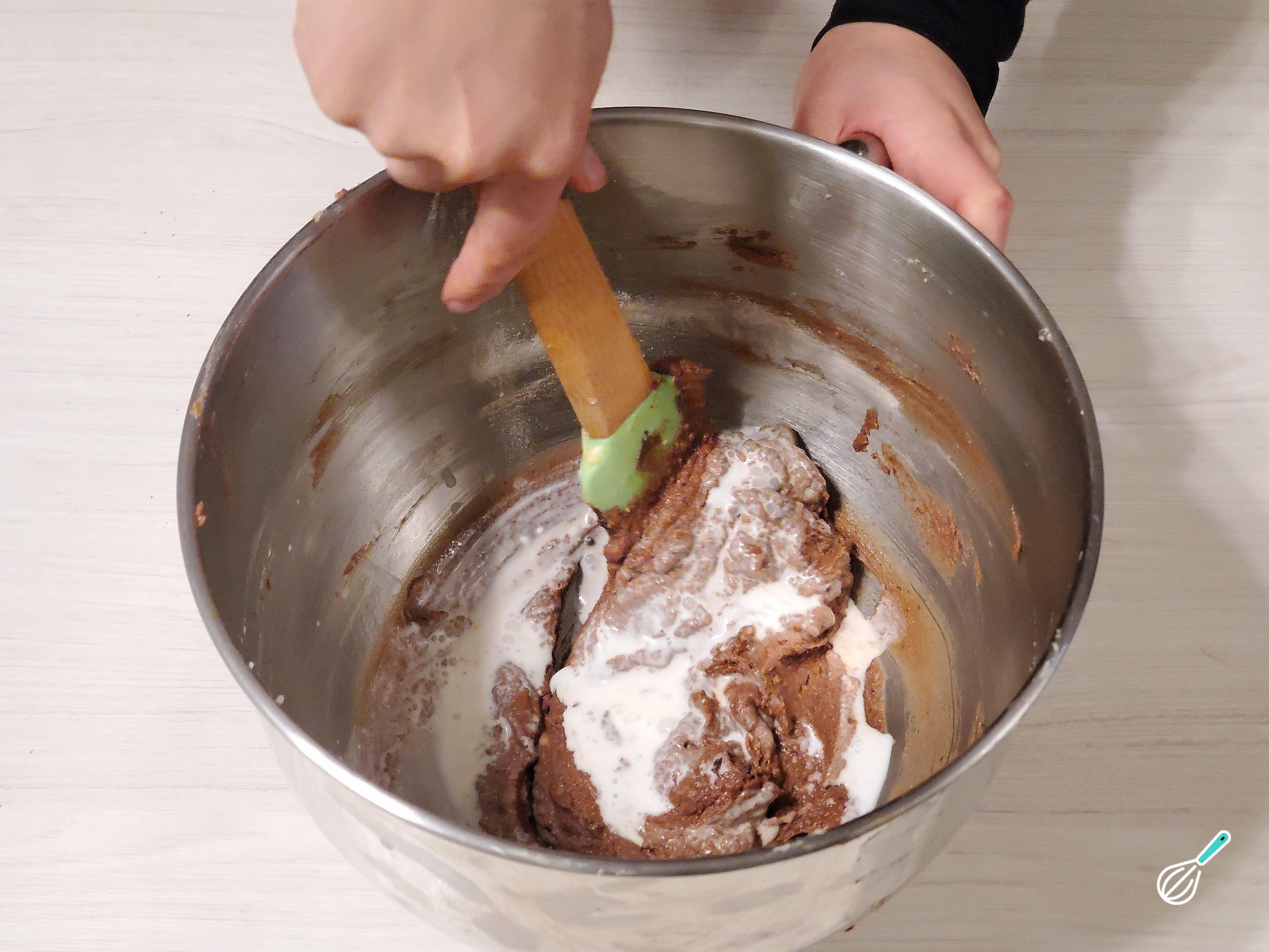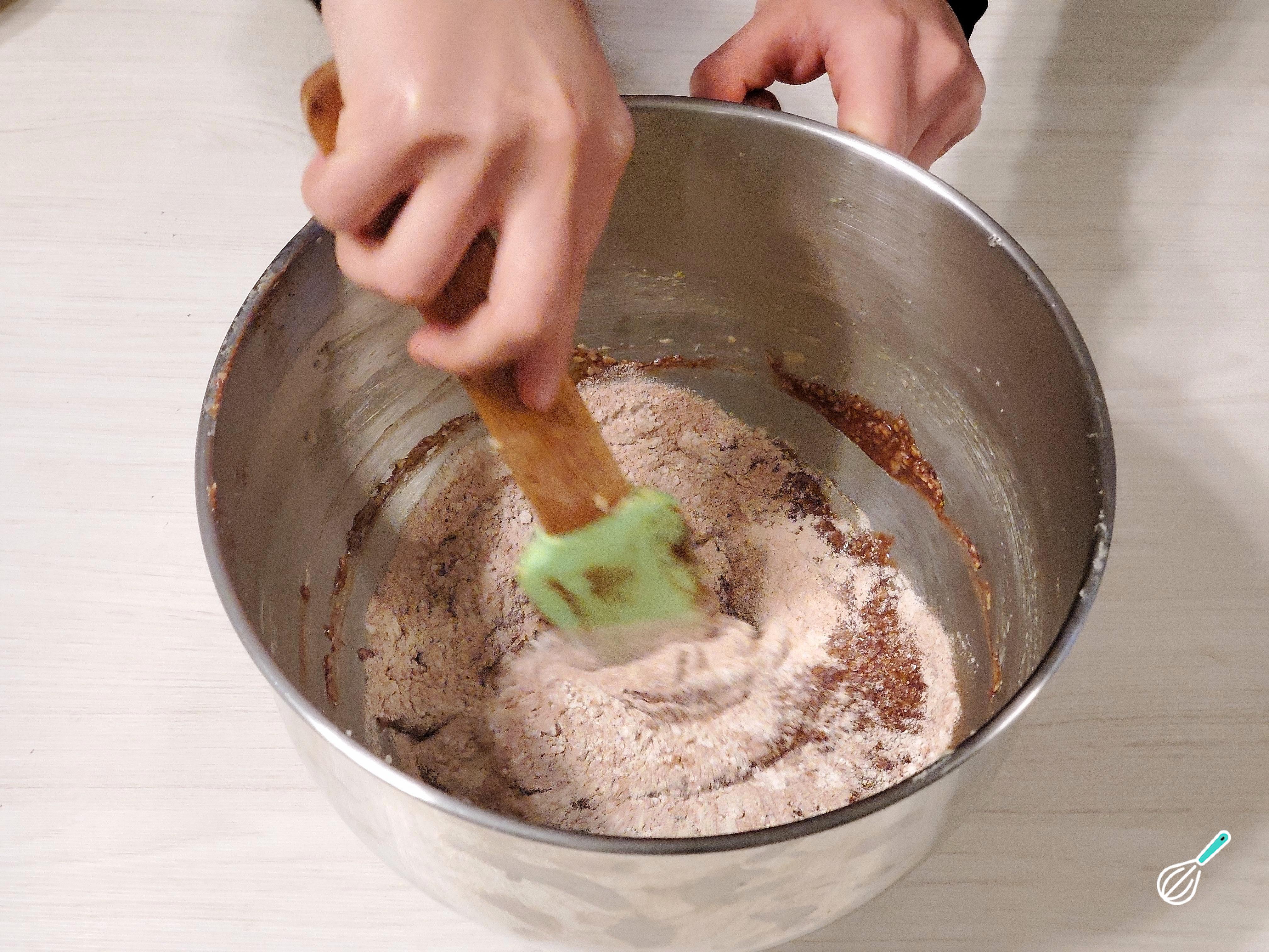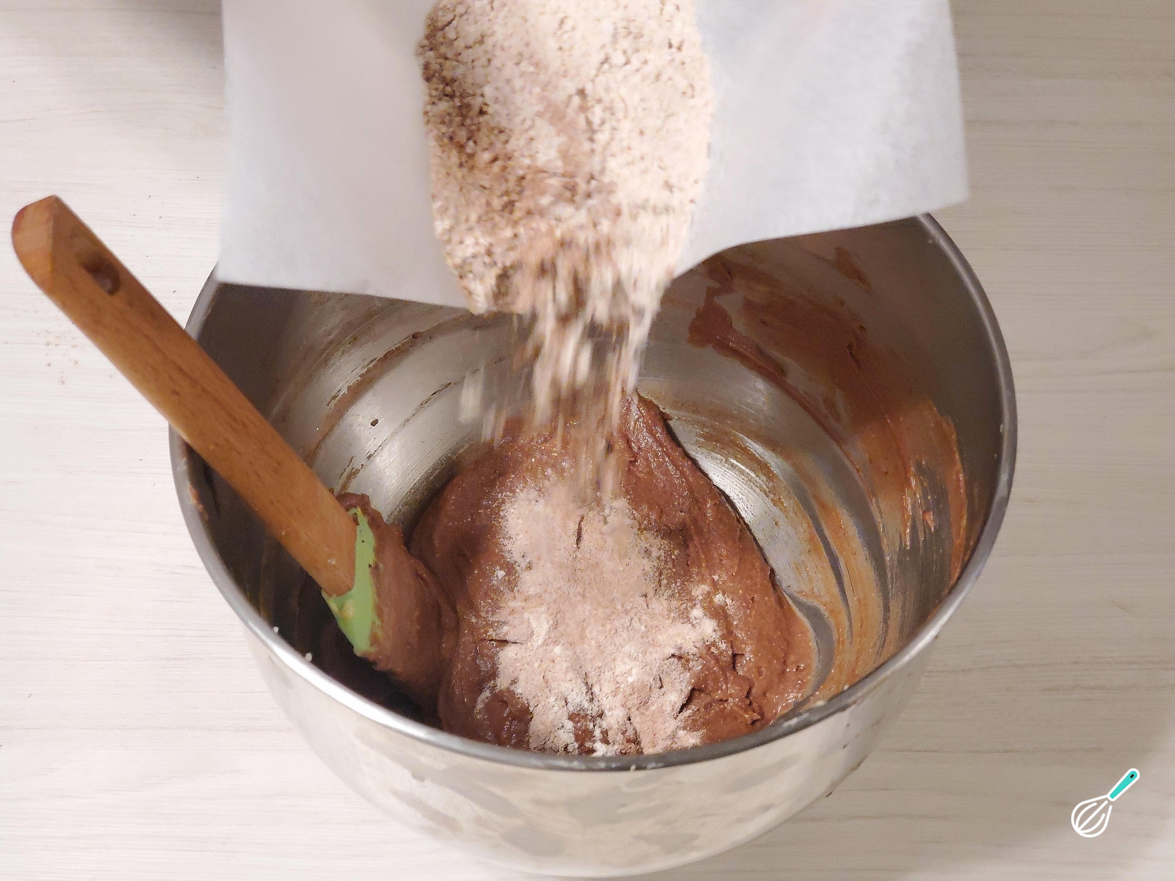 Despeje um terço dos ingredientes secos na massa de chocolate e misture em velocidade baixa ou use uma espátula de borracha em movimentos circulares.