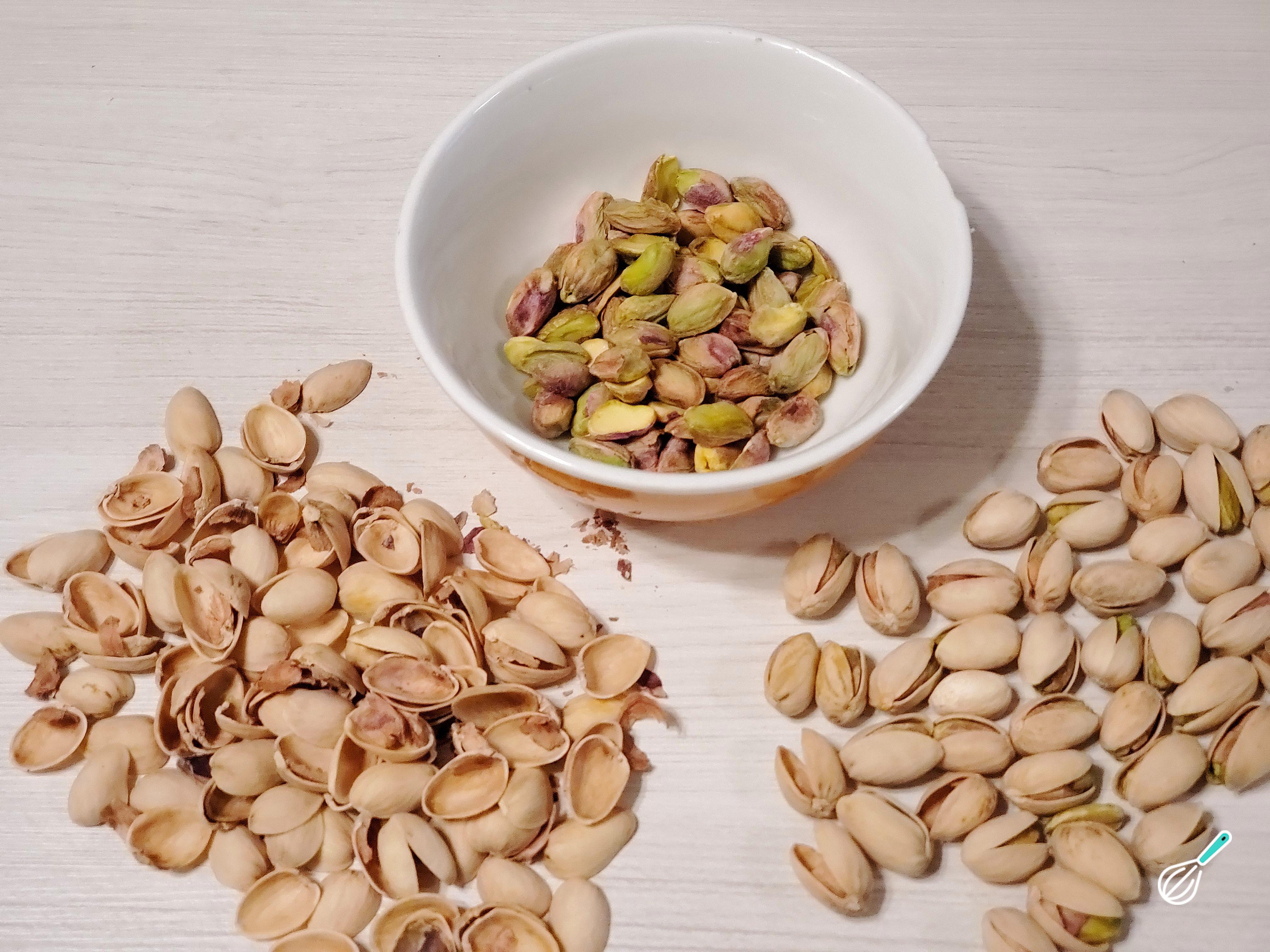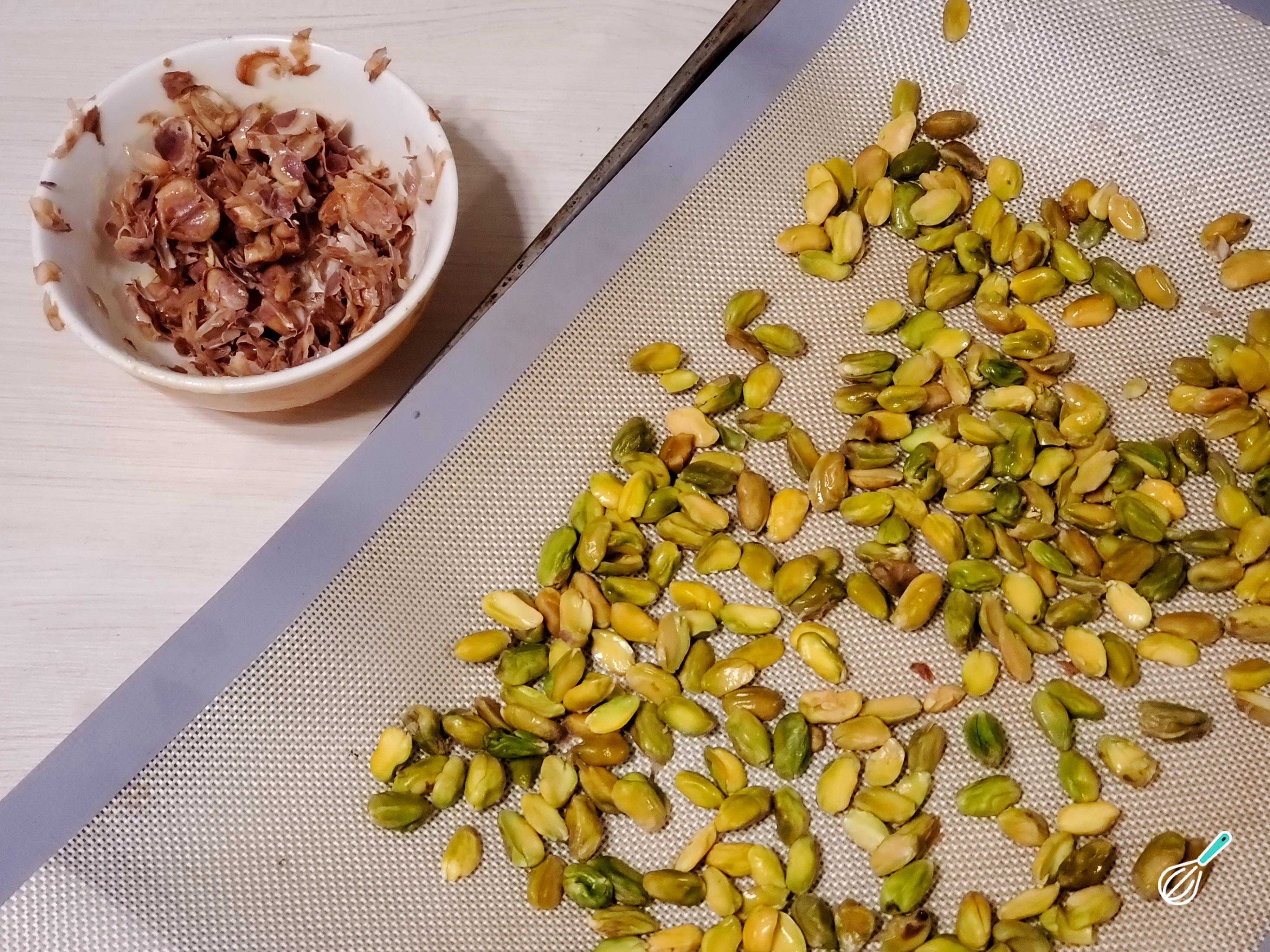 Depois de descascar todos os pistaches, coloque-os em uma forma e leve ao forno a 100 °C até ficarem crocantes. Não aumente o fogo, pois eles vão dourar e se isso acontecer eles não terão mais uma cor verde brilhante.