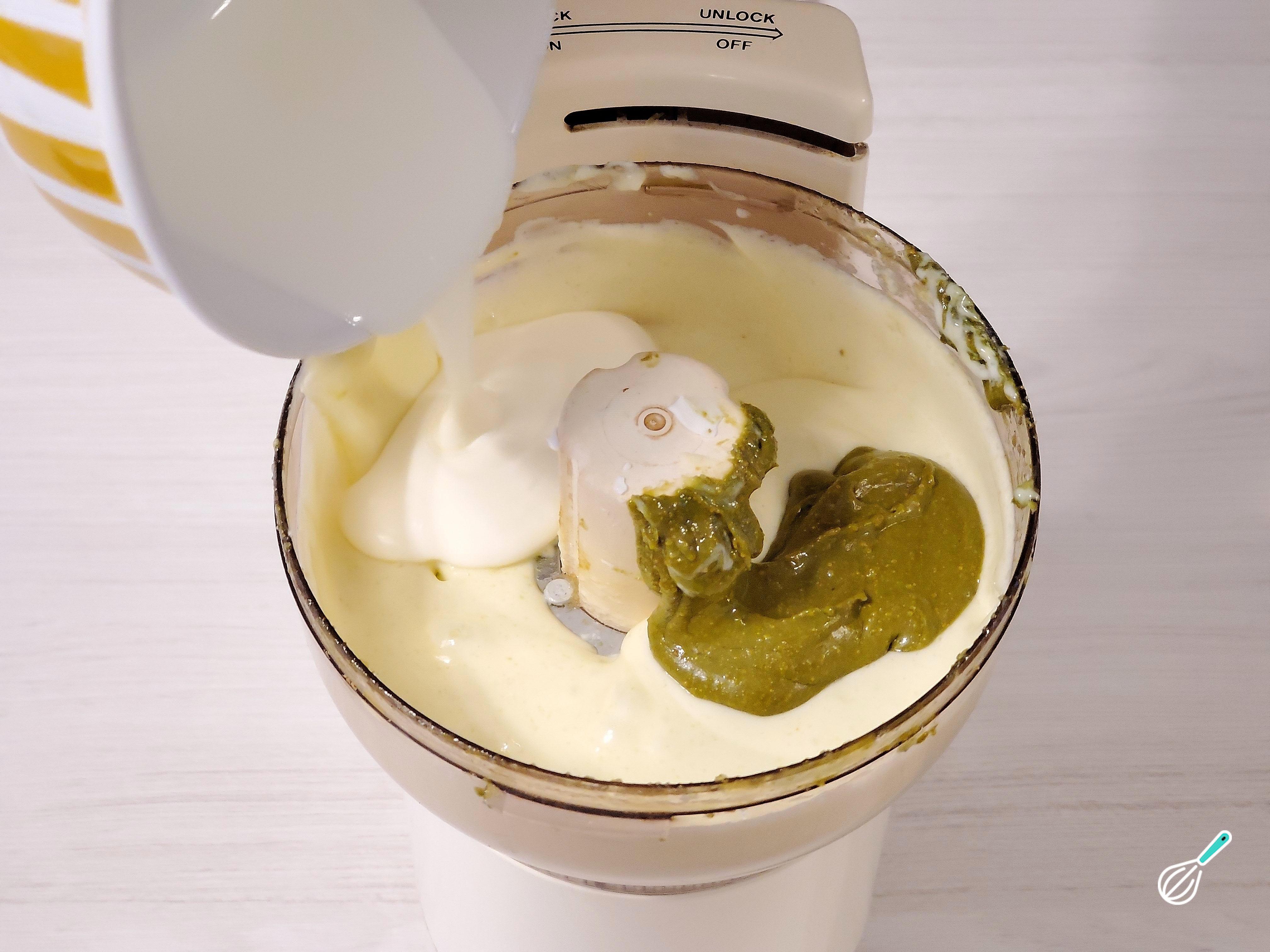Bata até obter um creme sem grumos, depois acrescente a pasta de pistache e o creme de leite.