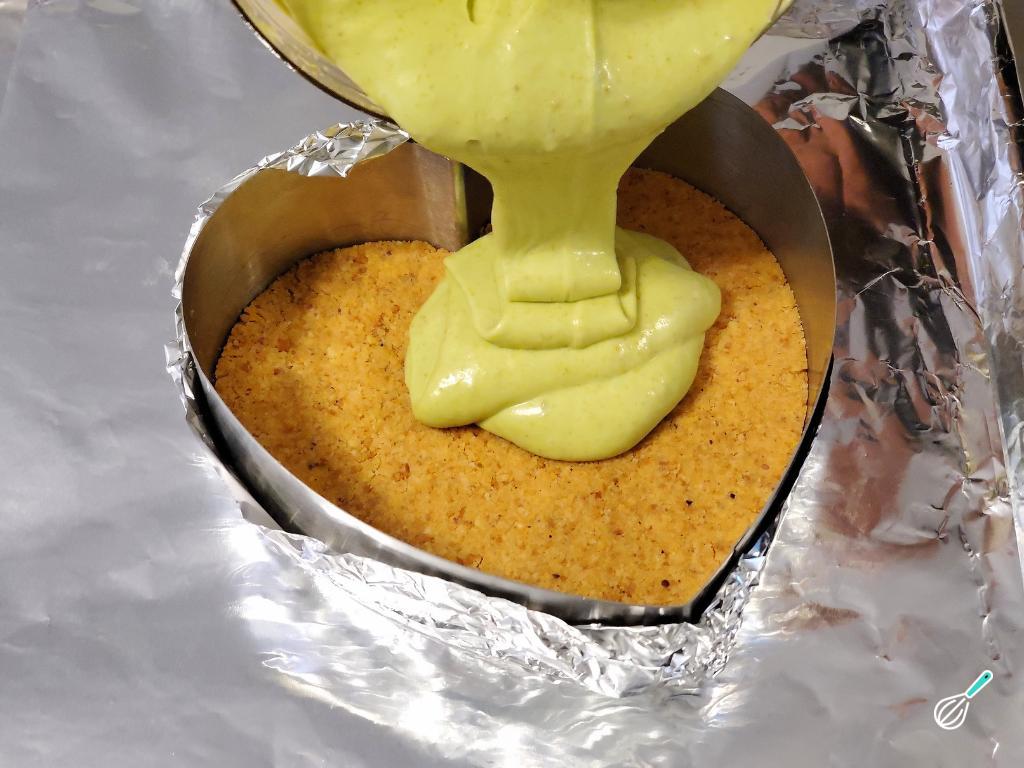 Adicione o creme de pistache caseiro e misture até que se incorpore ao ganache. Deixe esfriar por alguns minutos e despeje sobre o cheesecake .