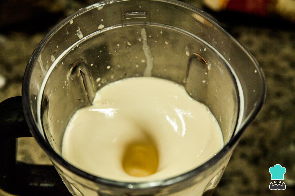 O primeiro passo desta receita de torta rabanada é bater no liquidificador os ovos, o leite, o leite condensado, a maisena e a essência de baunilha, até tudo ficar bem misturado.