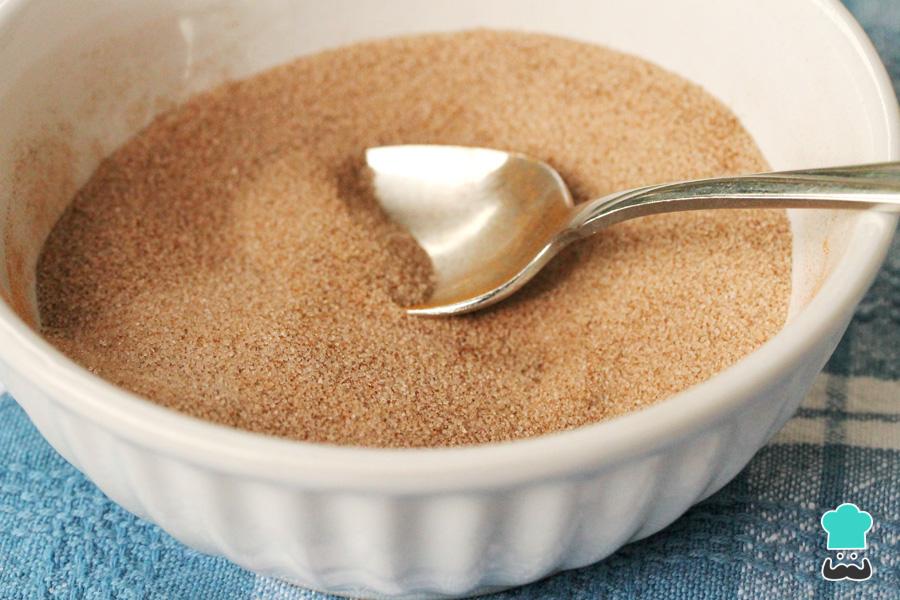 De seguida misture o açúcar e a canela numa tigela. Unte todo o interior de um refratário com a manteiga, e polvilhe o açúcar e canela de forma a cobrir toda a área untada. Reserve o que sobrar.