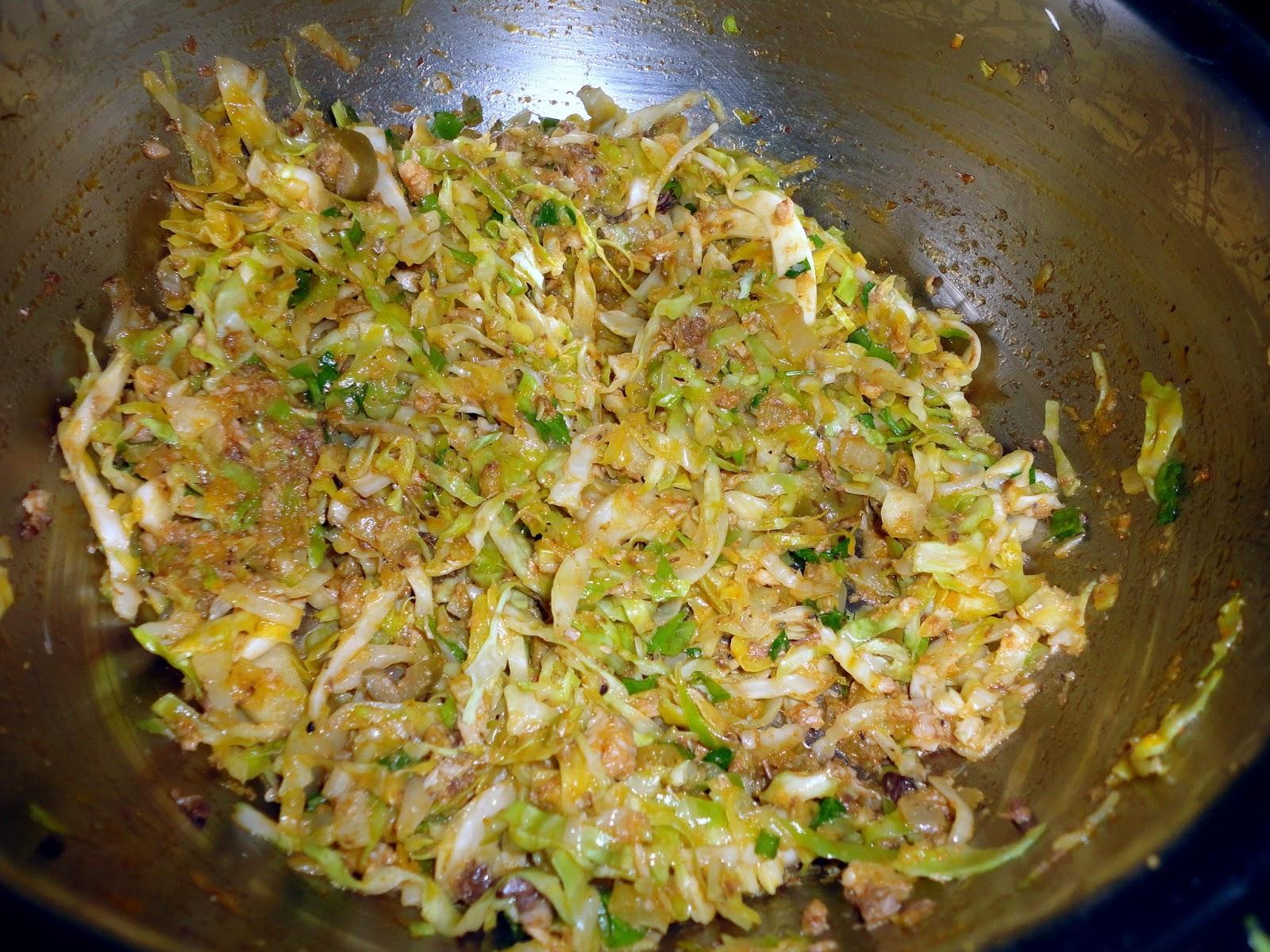 Ordem dos ingredientes, se refoga ou não antes a verdura, se frita a carne da a impressão que irá bater tudo no liquidificador repolho, carne, ovos, óleo, etc...