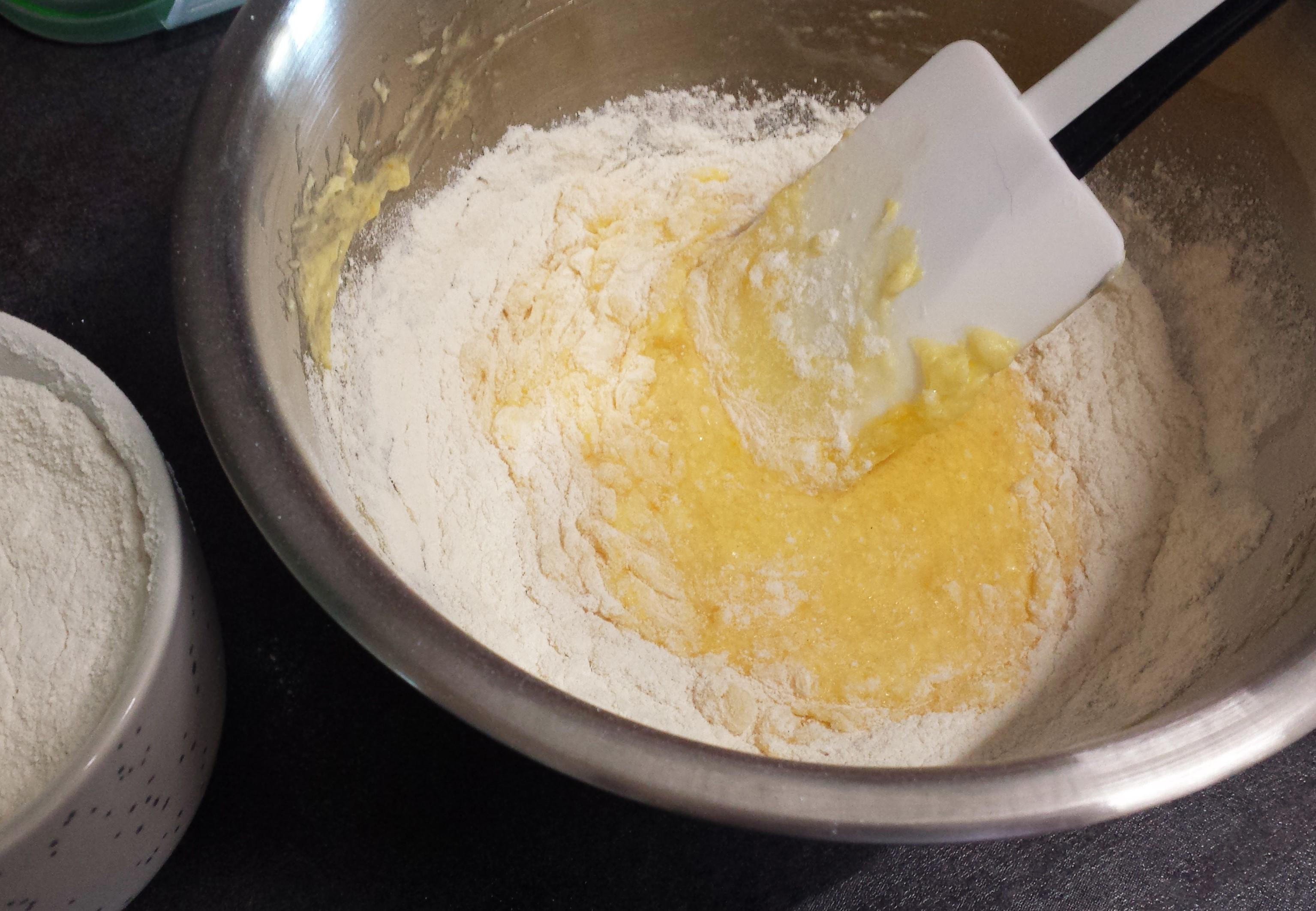 Misture a farinha e o fermento em uma tigela separada e adicione a mistura do liquidificador (do passo anterior). Mexa bem até formar uma massa homogênea e adicione os ingredientes do recheio.