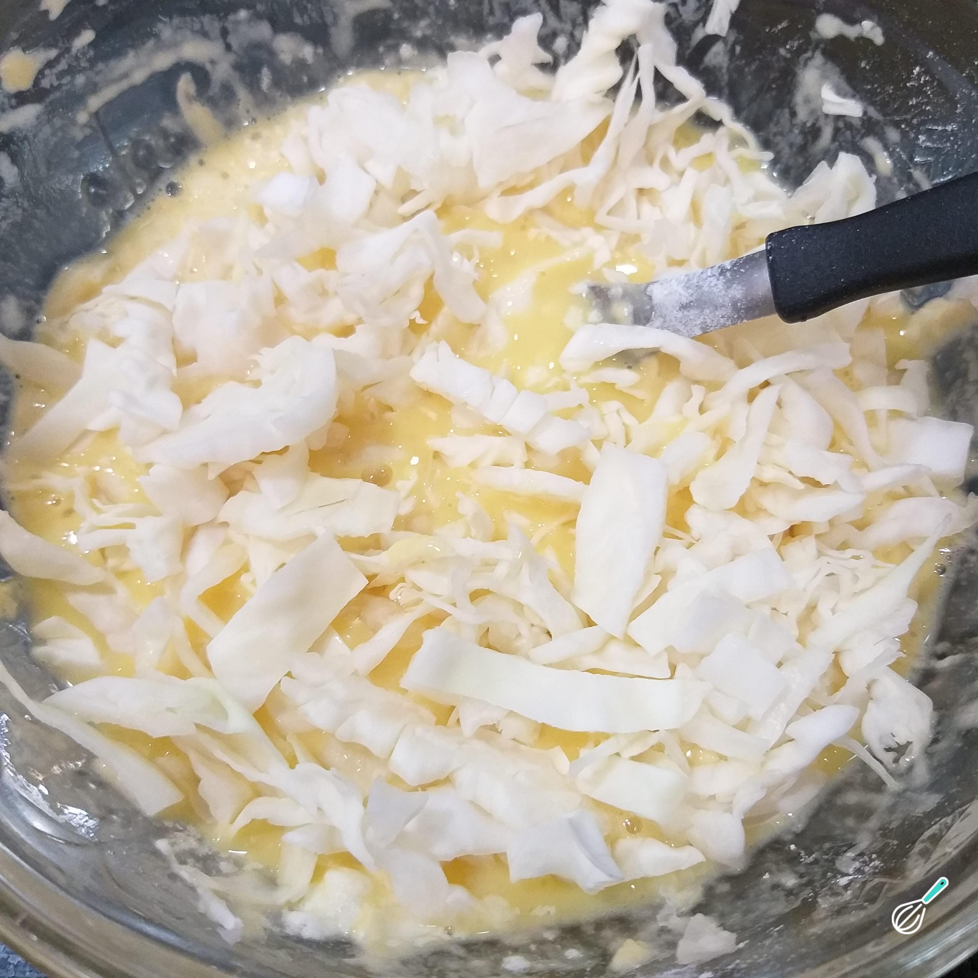 Em seguida coloque o repolho picado cru e o queijo. Continue a misturar e, por fim, ponha o fermento.