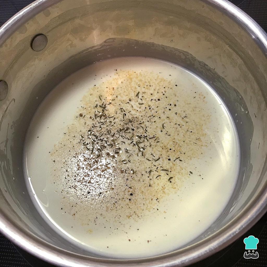 Enquanto a massa está no freezer e o salmão esfria, vamos ao recheio. Misture numa panela o creme de leite com os temperinhos (tomilho, alho em pó, sal e pimenta) e a maizena. Aqueça em fogo médio até começar a ferver, mexendo sempre.