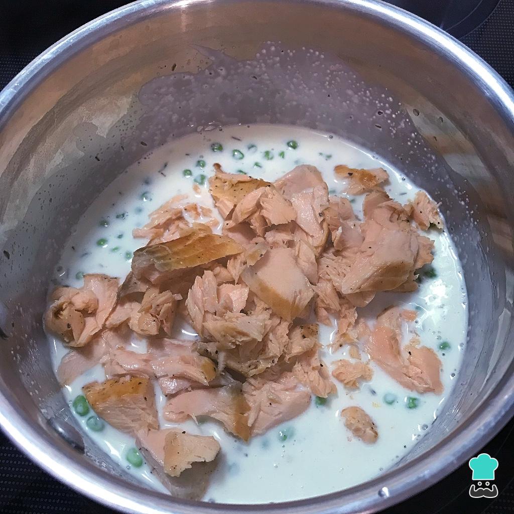 Desligue o fogo, adicione as ervilhas e o salmão já frio e despedaçado e misture. Está pronto o recheio desta receita de torta de salmão com massa podre!