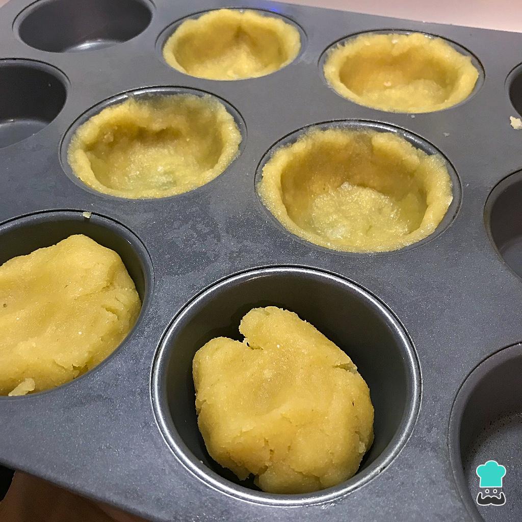 Distribua a massa em forminhas (usei uma forma de muffin), sem precisar untar, e lembrando de guardar parte da massa para cobrir a tortinha. Leve para assar em forno a 200°C por 10 minutos.