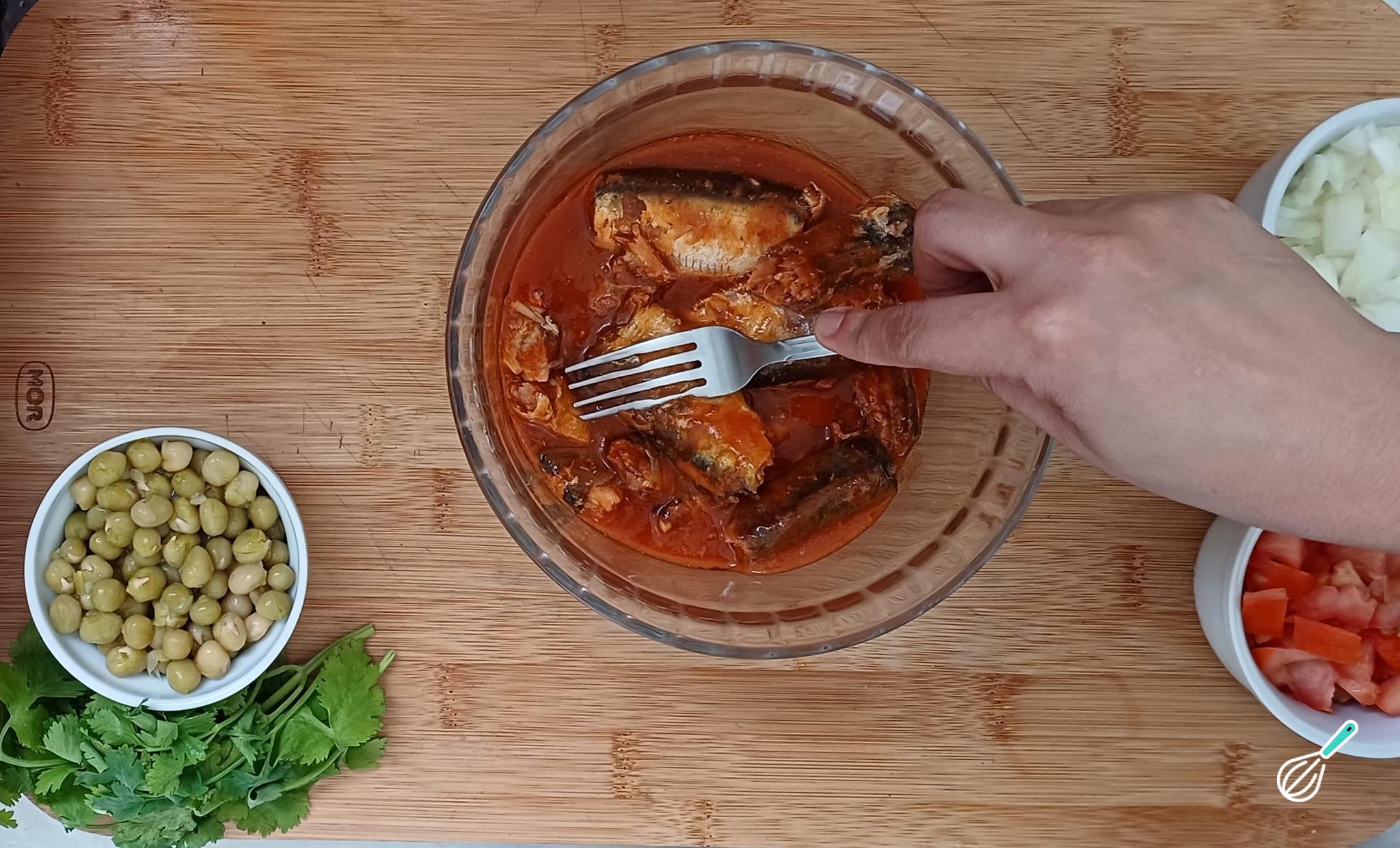Amasse a sardinha com o auxílio de um garfo.