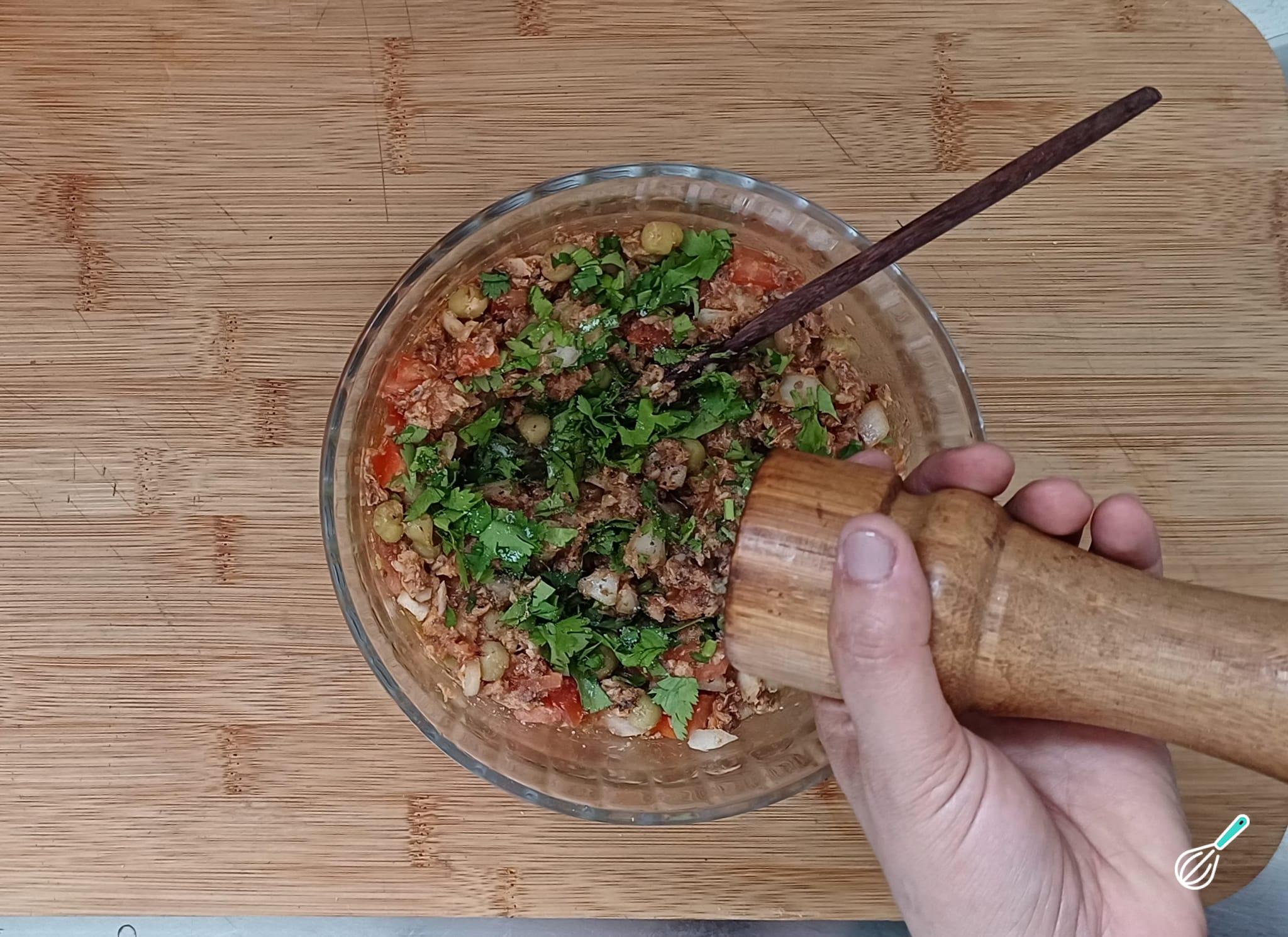 Adicione o tomate, a cebola, o coentro, a ervilha (escorrida) e tempere com sal e pimenta-do-reino, misturando bem. Reserve.