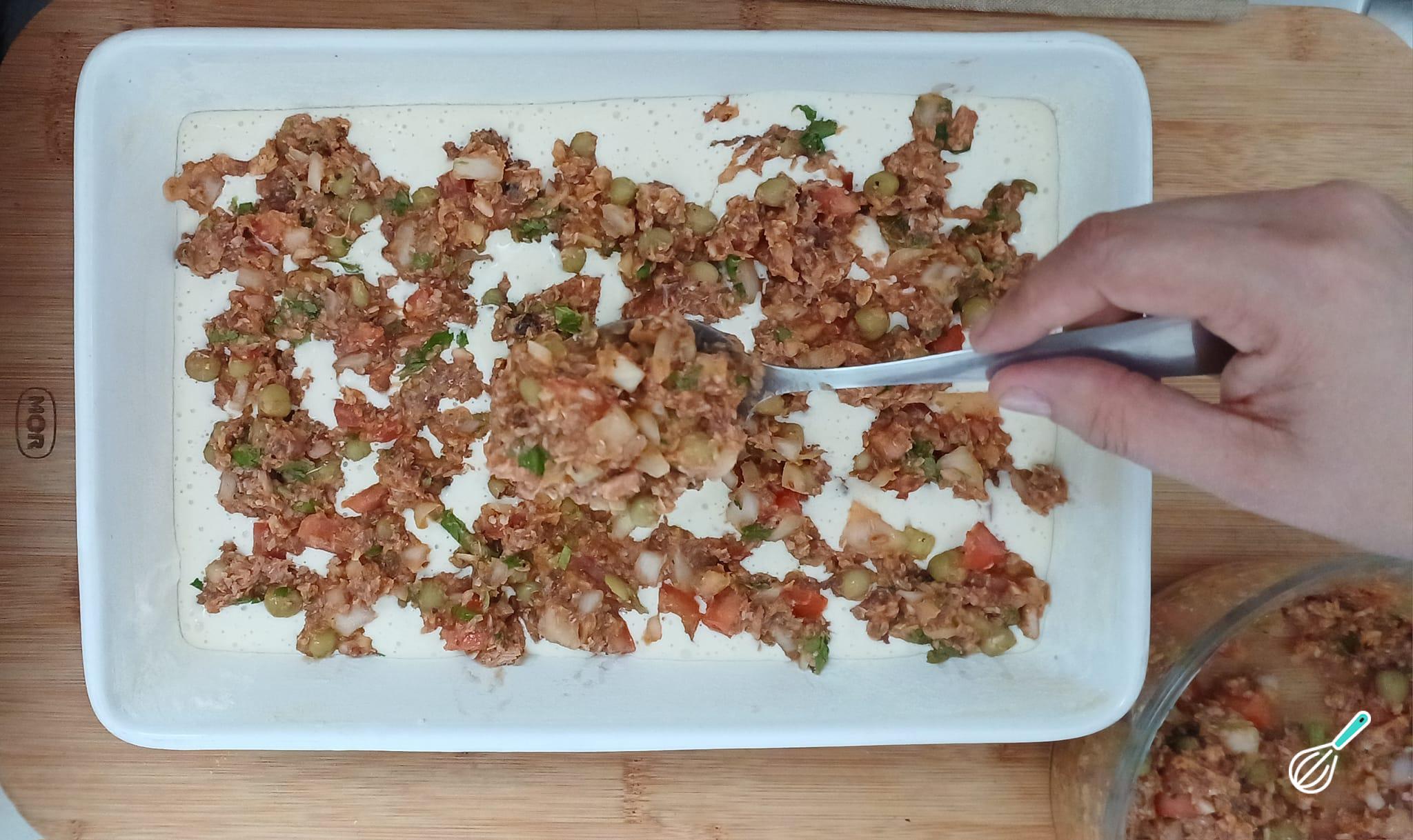 Num refratário médio, untado e enfarinhado, distribua metade da massa e cubra com o recheio de sardinha, espalhando com uma colher.
