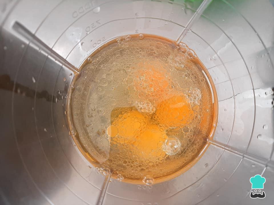 No liquidificador coloque os ingredientes líquidos (ovos, água e óleo) e, em seguida, acrescente a farinha de trigo e o sal, batendo até misturar bem.