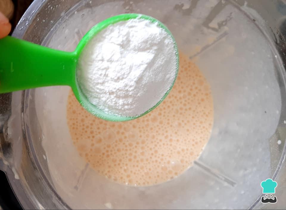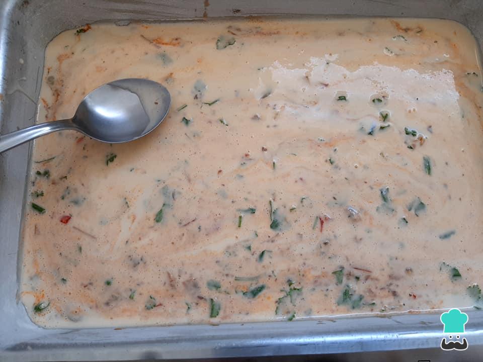 Quando a massa estiver lisa e homogênea, acrescente o fermento em pó e misture com uma espátula até incorporar à massa.