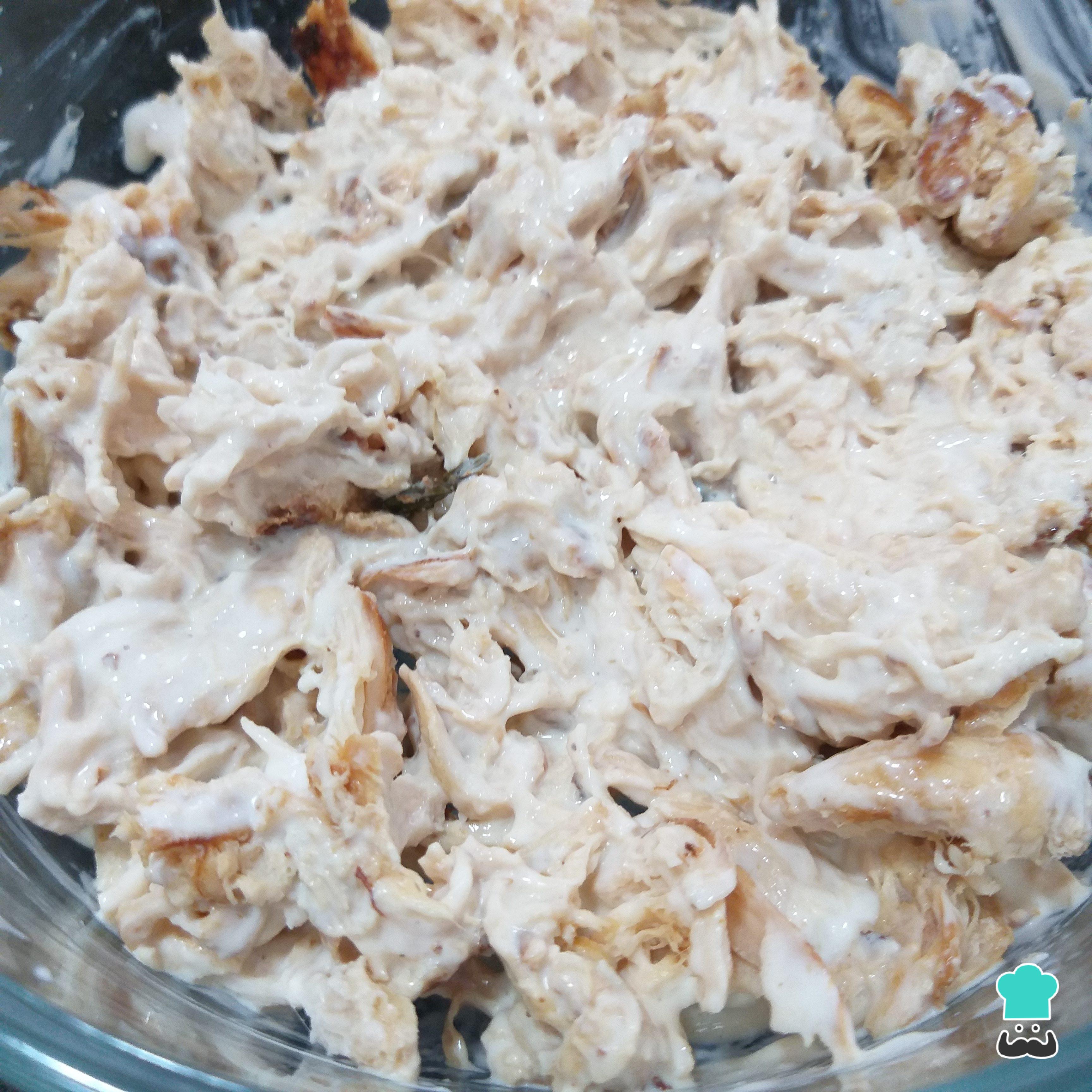 Em uma vasilha misture o frango, o requeijão e o sal. Esse será o recheio desta torta salgada low carb, reserve.