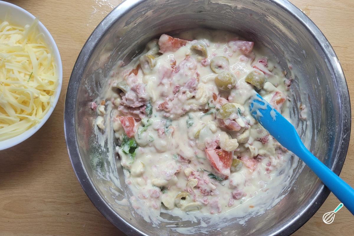 Eu gosto de fazer assim envolvendo todos os ingredientes do recheio com a massa. Outra opção é transferir metade da massa para a forma untada, espalhar o recheio e cobrir com o restante da massa. Mas acho que assim a torta fica mais úmida.