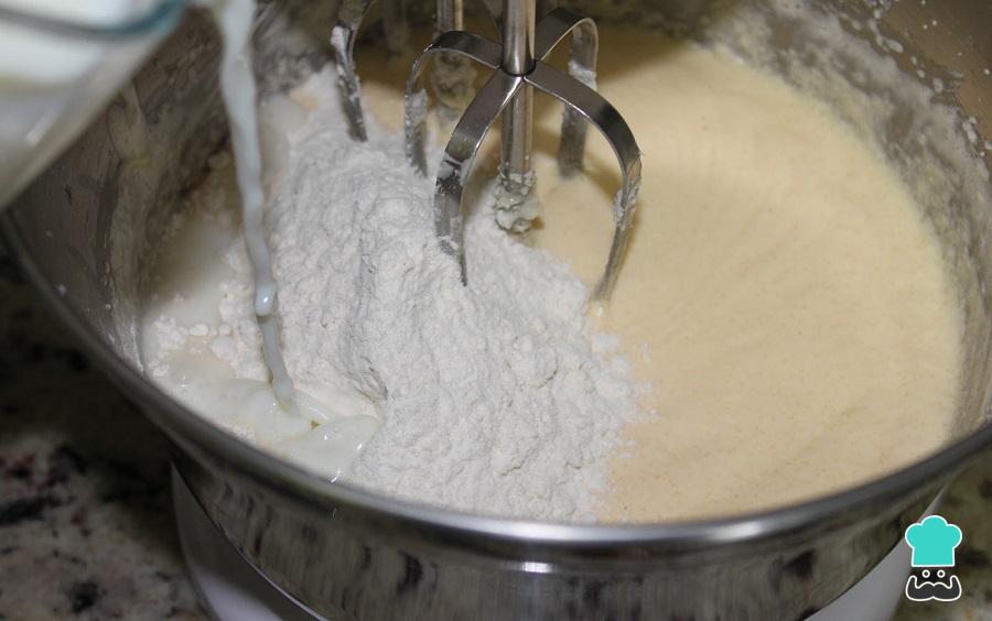 A primeira coisa a fazer para preparar essa torta de tres leches é bater a manteiga com o açúcar. Em seguida acrescente os ovos um a um e a farinha aos poucos, intercalada com o leite. Mexa até que todos os ingredientes se incorporem e adicione o fermento no final.