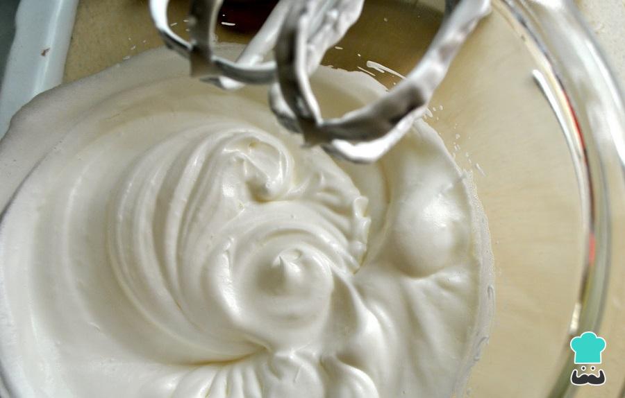 Finalmente, para preparar o merengue bata o creme de leite em ponto neve e acrescente açúcar de confeiteiro a gosto, até ficar brilhante.