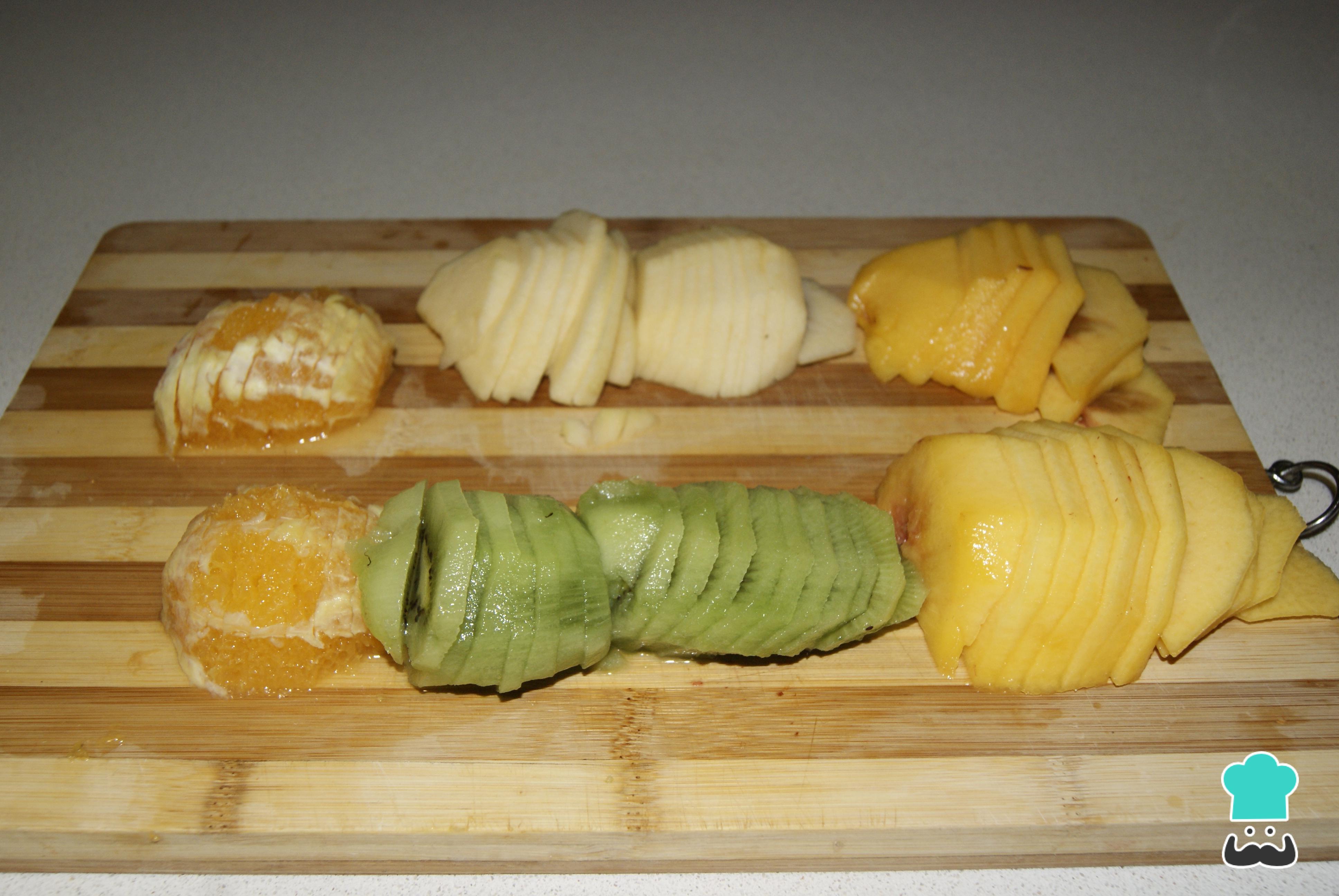 O passo seguinte é descascar as frutas e cortar em rodelas com mais ou menos o mesmo tamanho. É importante que todas as frutas sejam cortadas do mesmo jeito, para que a apresentação da torta fique mais bonitinha.